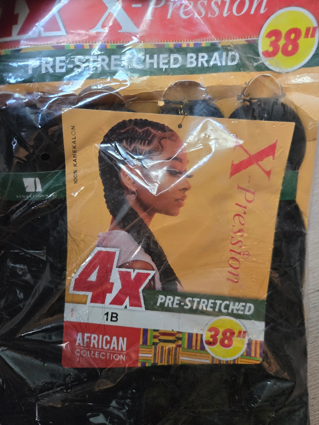 65Selling X-Pression pre-stretched braid in the African Collection! It's 38 inches and the colour is 1B. This braid is 100% Kanekalon