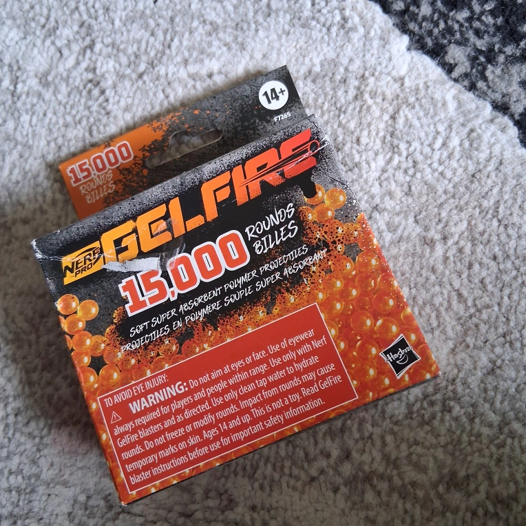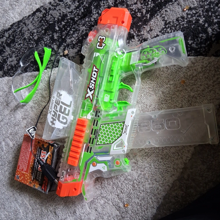 Selling an X-Shot Hyper Gel Trace Fire blaster. It comes with safety glasses. Also included is a box of Nerf Pro GelFire 15,000 rounds. These are soft, super absorbent polymer projectiles.
