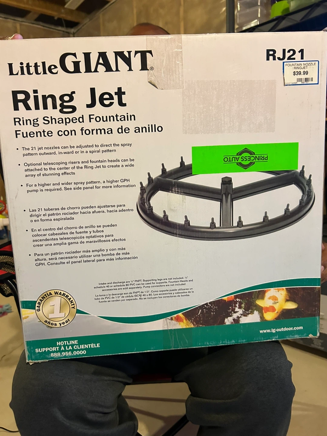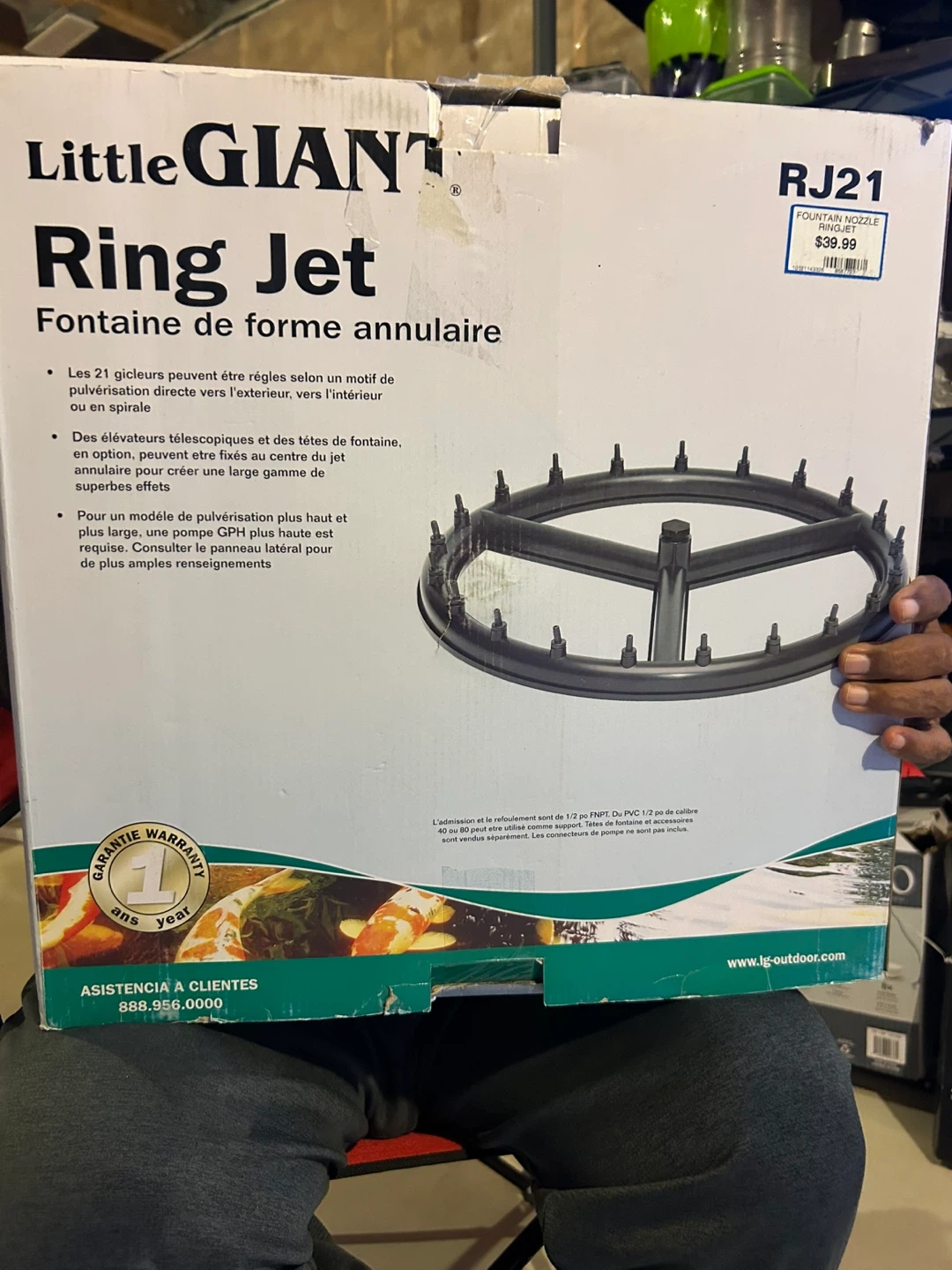 This Little Giant Ring Jet fountain nozzle features 21 adjustable nozzles for customizable spray patterns. It includes telescoping risers and fountain heads that attach to the center for a wide spray. For a higher and wider spray pattern, a GPH pump is required.