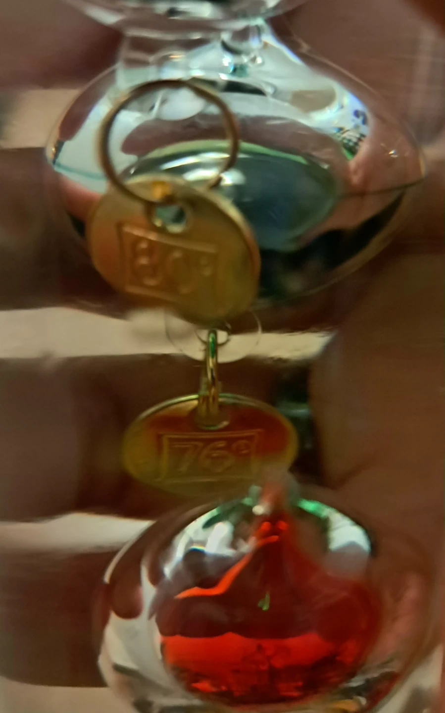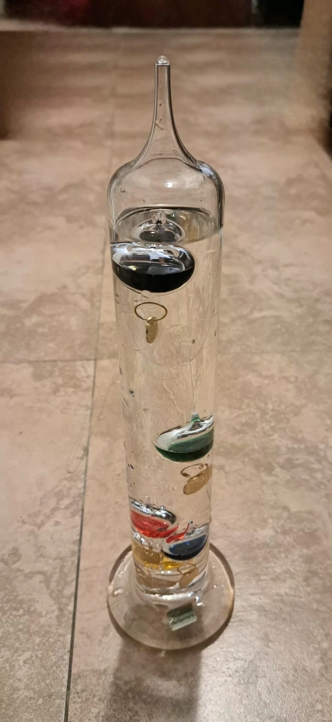 Here's a Galileo thermometer for sale! It's a decorative and functional piece that measures temperature using the principle of buoyancy. This thermometer features colourful glass spheres that rise and fall within a clear glass cylinder as the temperature changes. It's in great condition and would make a lovely addition to any home or office!