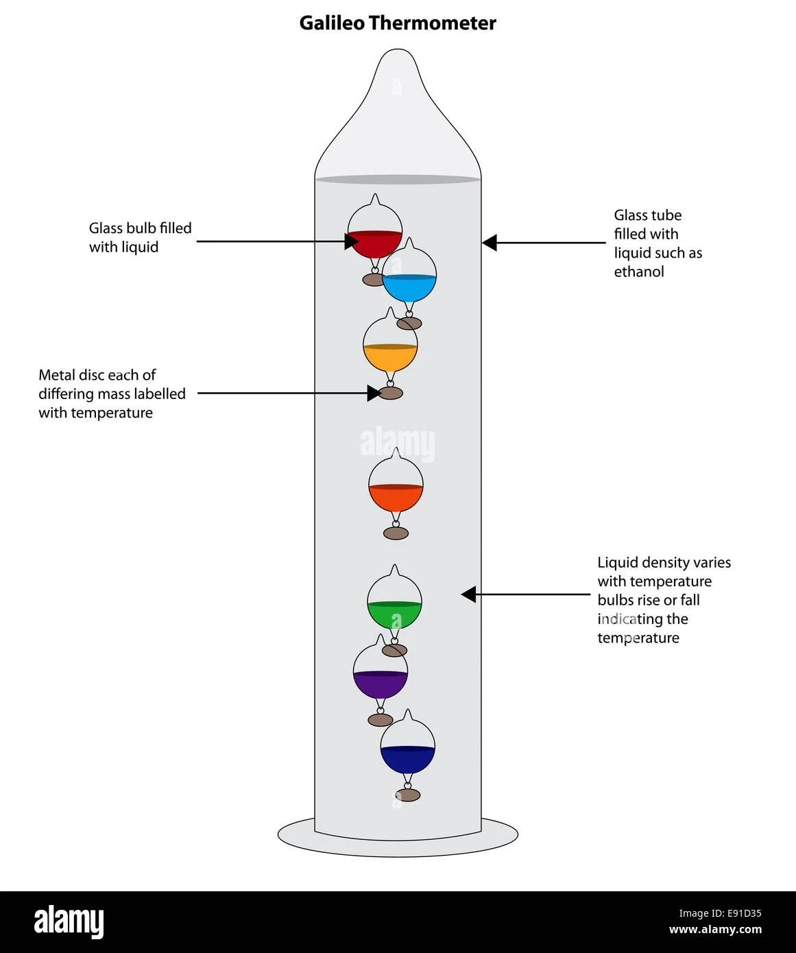 This Galileo Thermometer from Bits and Pieces is made of a glass cylinder and contains clear liquid with several glass vessels containing liquid of different density. As the temperature changes, the multi-colored balls rise and fall within the liquid-filled thermostatic tube.