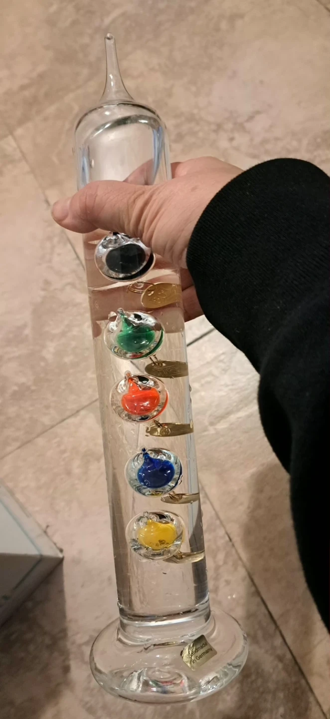 Here's a Galileo thermometer for sale! It's a decorative and functional piece that measures temperature using the principle of buoyancy. This thermometer features colourful glass spheres that rise and fall within a clear glass cylinder as the temperature changes. It's in great condition and would make a lovely addition to any home or office!