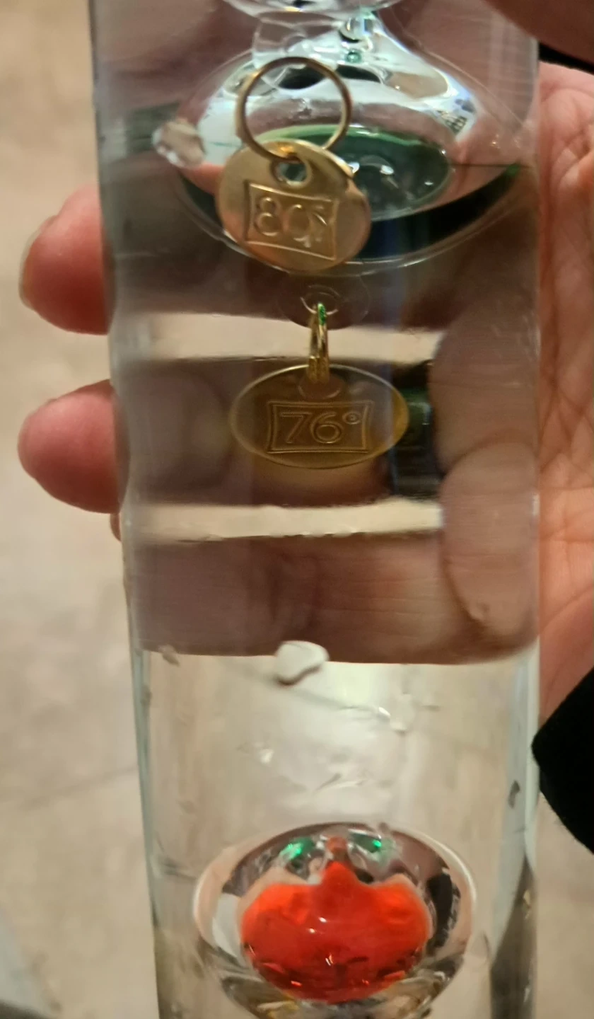 The lowest sphere in the top group within the instrument indicates ambient temperature. The Galileo Thermometer from Bits and Pieces is made from glass, measures 13.5 -inches tall, and contains five different temperature indicators.