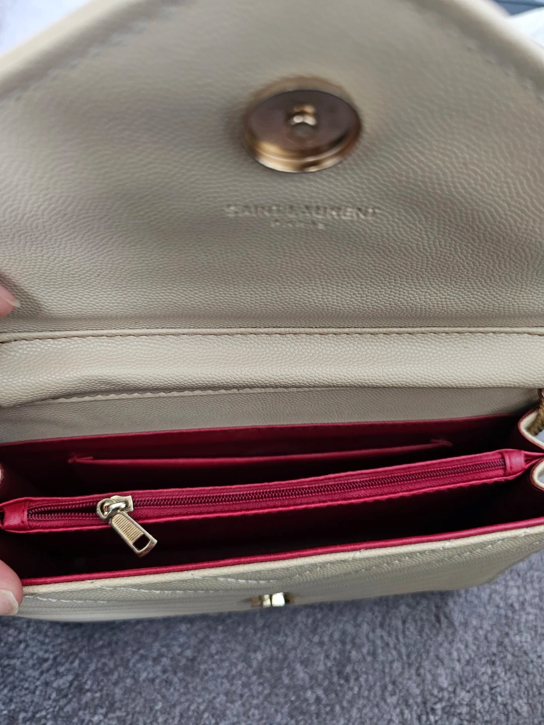 YSL-inspired wallet bag in beige chevron quilted leather. It has a snap closure and a gold chain strap.
