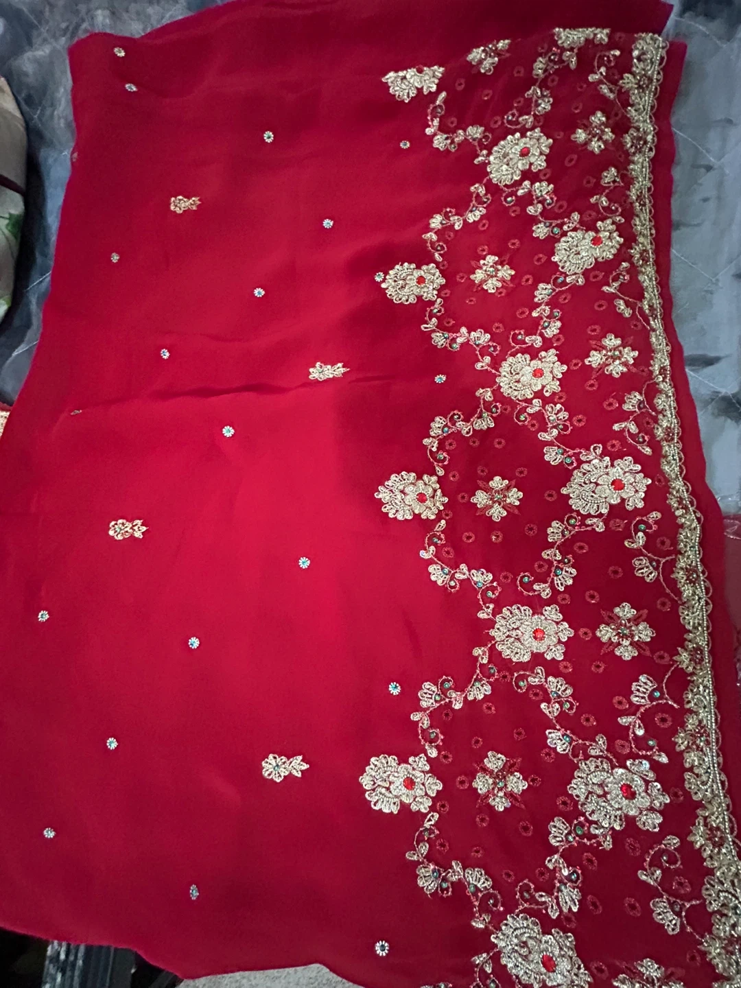 Beautiful red sari with intricate gold embroidery! The fabric is lightweight and drapes nicely. It's in great condition, ready for a special occasion or cultural event