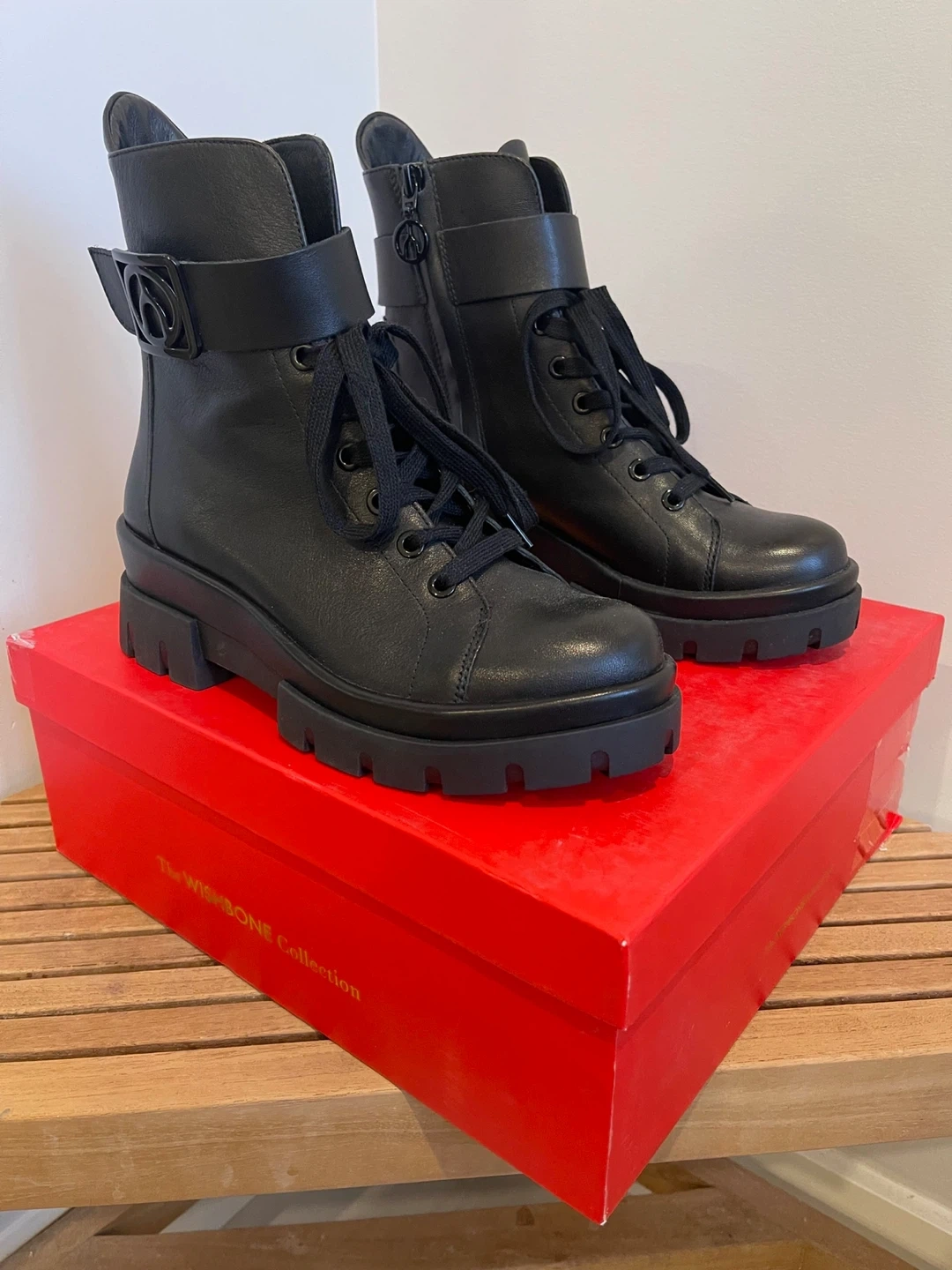 Selling a pair of Browns Wishbone Collection Floria boots in black. These are a size 6 but fit large, more like a size 6-1/2 - 7 (I wear size 7 and they fit). Comes with the original box. The boots are made of black calf leather with a black sole. Originally bought for $298 + tax. Brand new, never worn!
