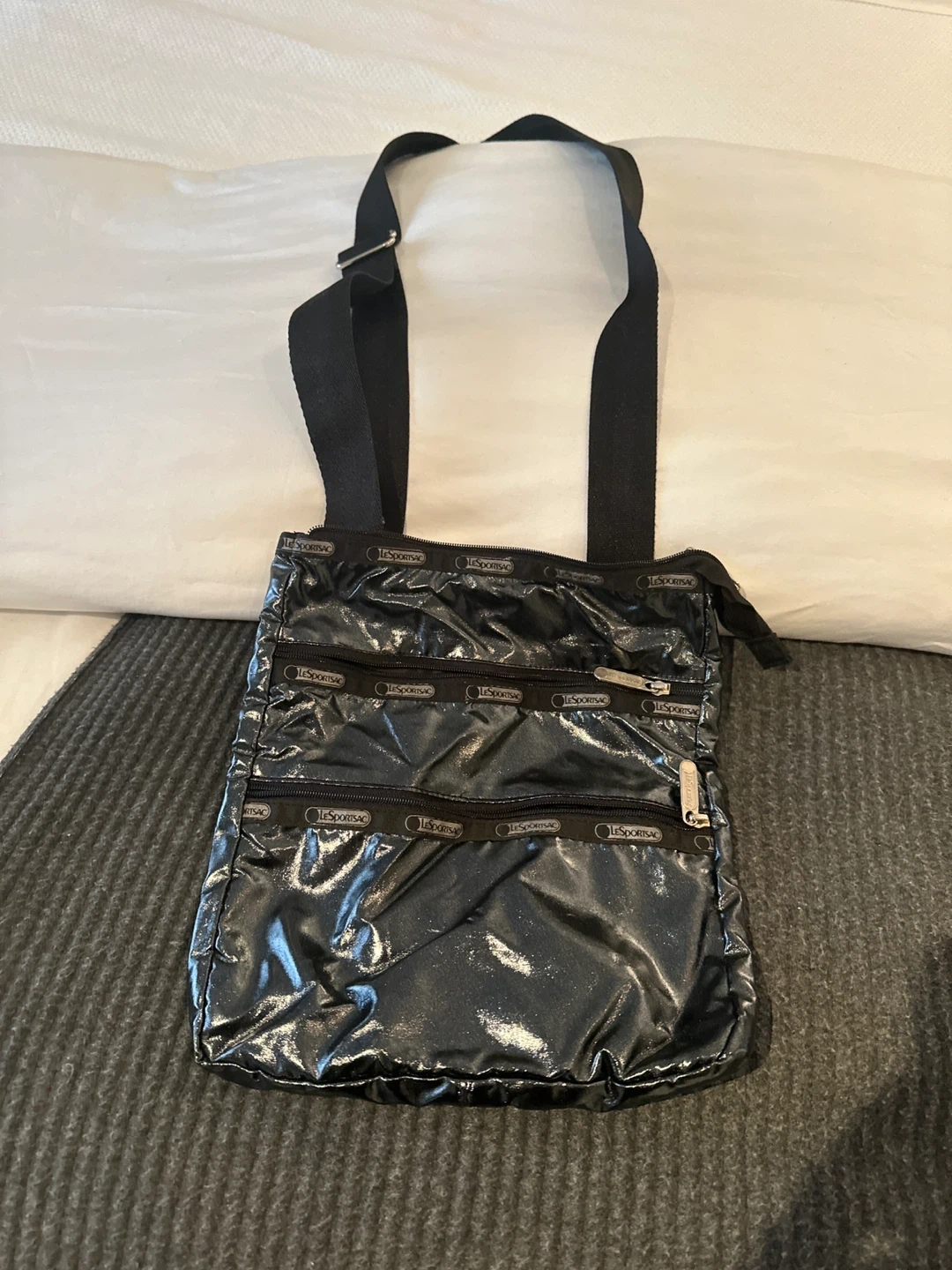 This is a LeSportsac crossbody bag in black with a shiny finish. It features multiple zippered compartments. The adjustable strap makes it comfortable to wear.