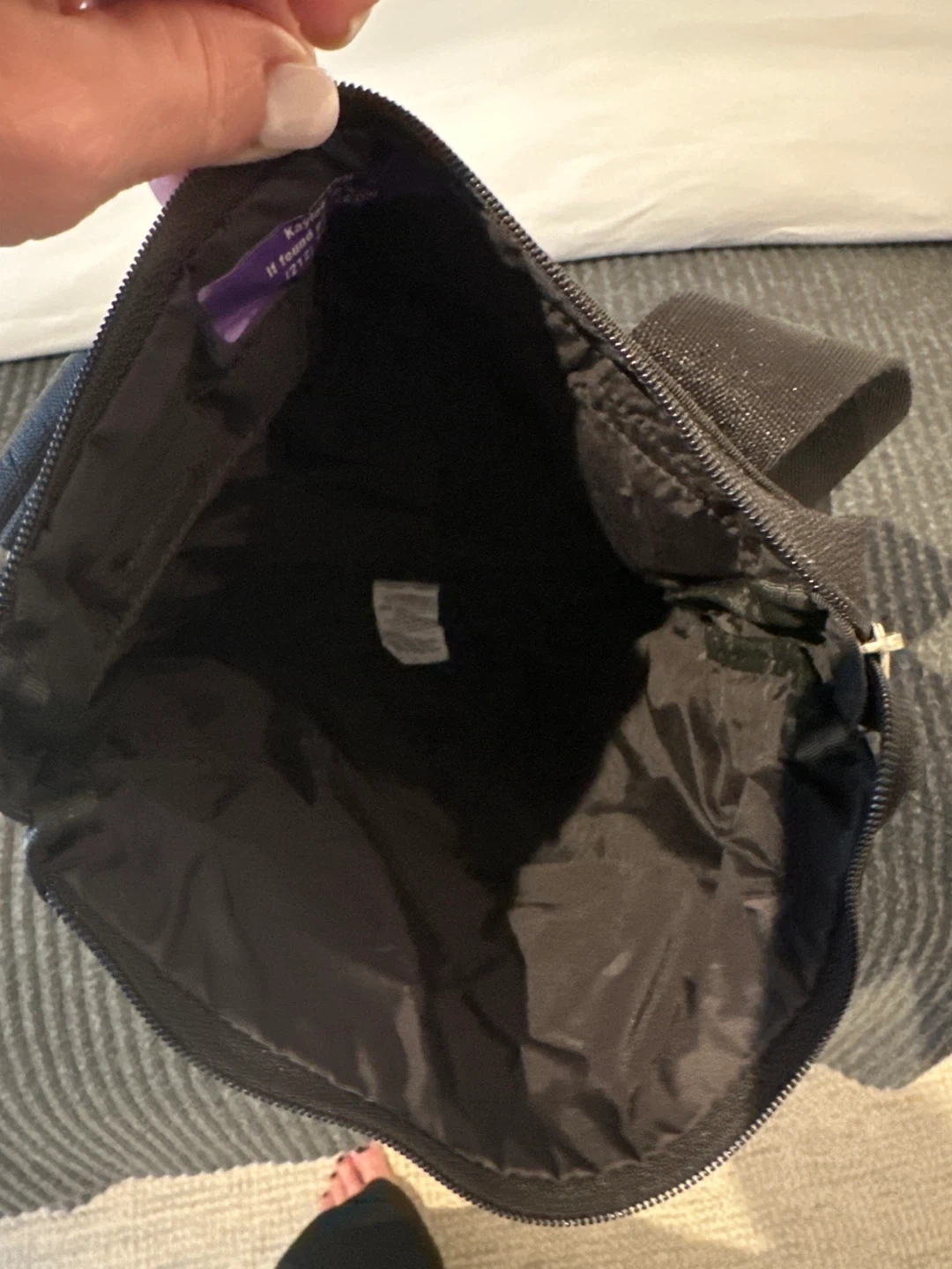This is a LeSportsac crossbody bag in black with a shiny finish. It features multiple zippered compartments. The adjustable strap makes it comfortable to wear.