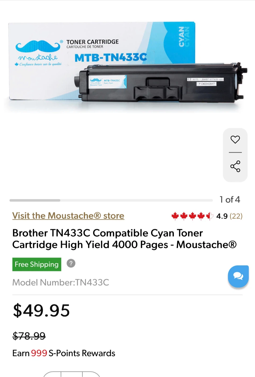 I'm selling a brand new Moustache MTB-TN433C toner cartridge in cyan! This toner cartridge is compatible with several Brother printer models including HL Series HL-L8260CDW and HL-L8360CDW.