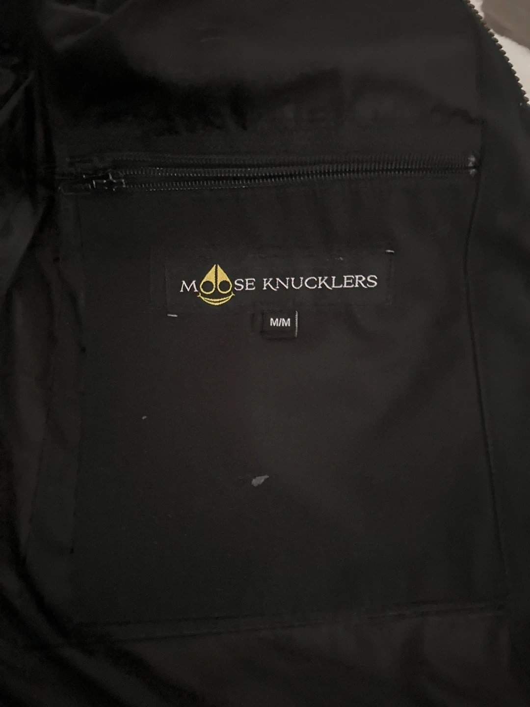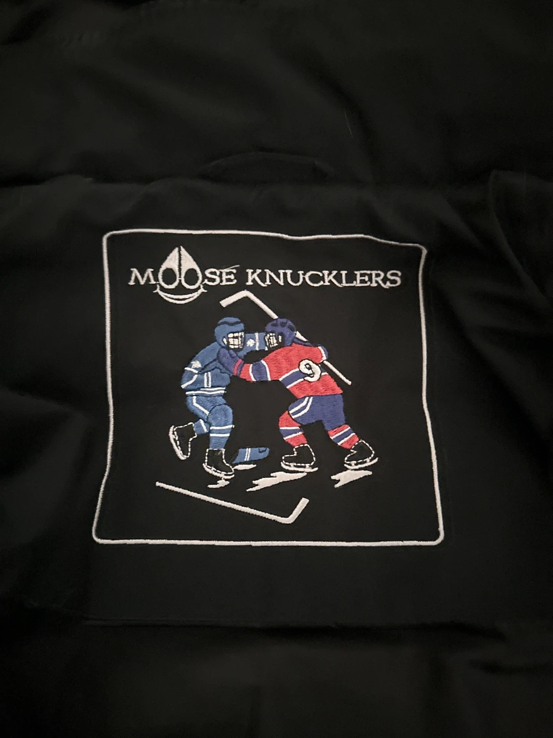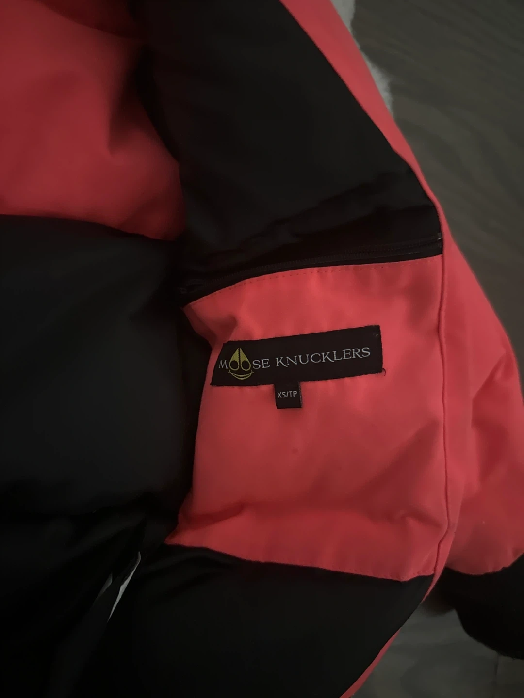 Two Moose Knuckles kids jackets, one black and one bright pink. Both feature fur-trimmed hoods and the signature Moose Knuckles logo. Great for keeping little ones warm and stylish! Each one is 250