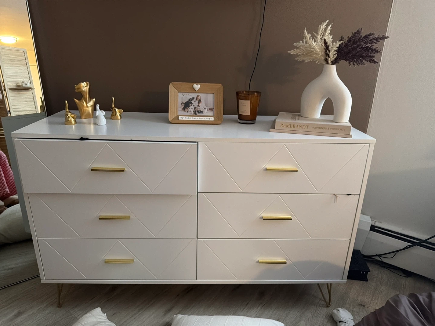 White 6-drawer dresser with gold hardware and tapered legs. The front of each drawer features a geometric pattern. A small scratch is visible on the top right drawer. It's perfect for organizing bedroom essentials!