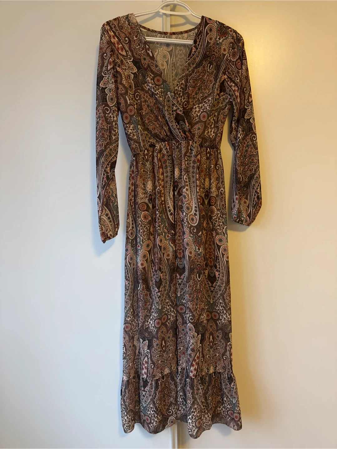 Selling a beautiful paisley print maxi dress! It features long sleeves and a flattering V-neckline. The dress is in great condition and perfect for any occasion