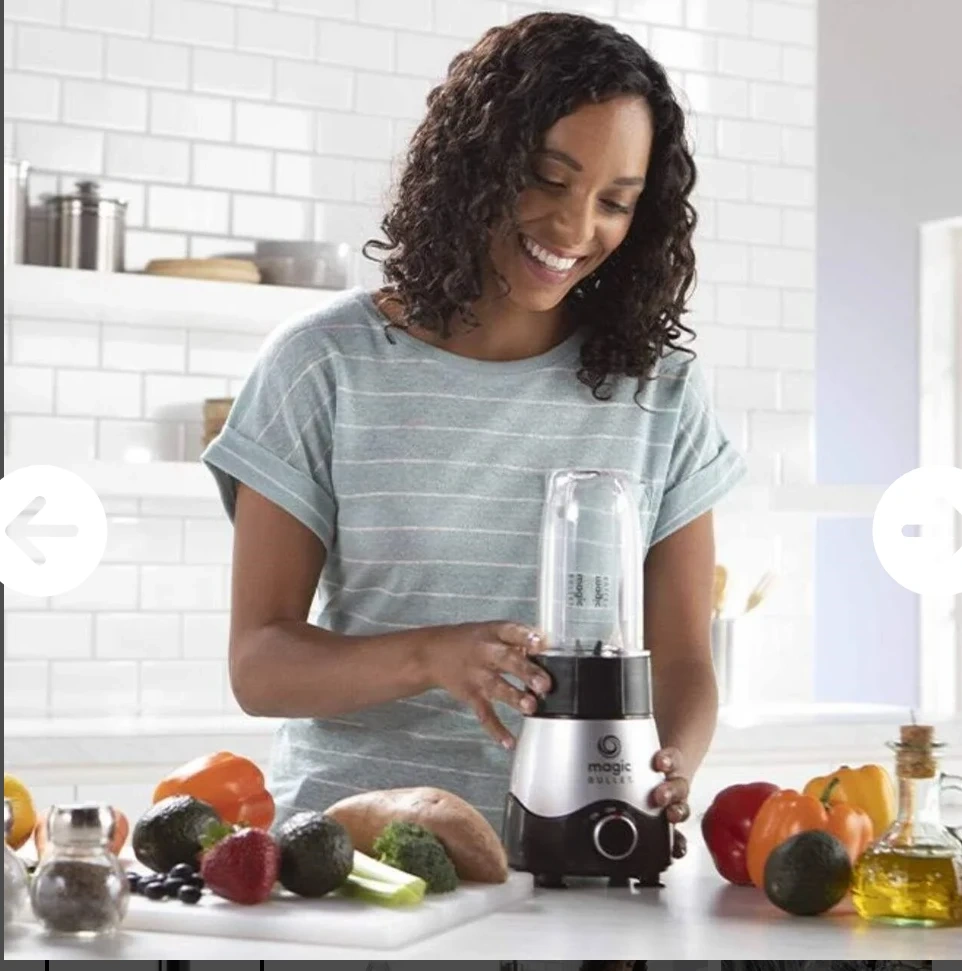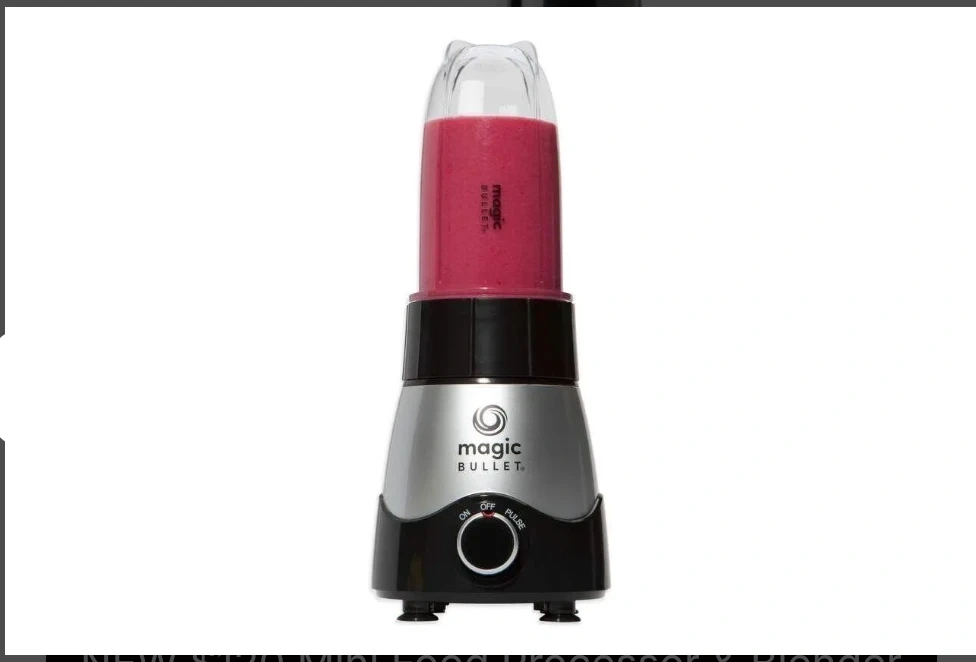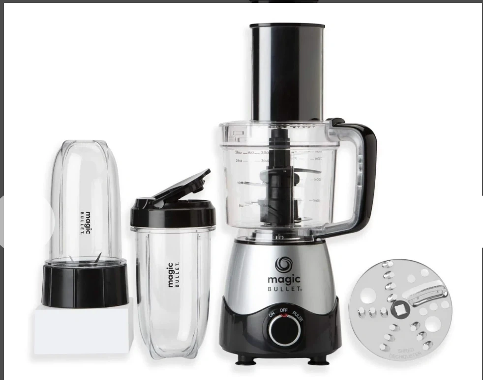 The Magic Bullet Kitchen Express™ Countertop Blender & Food Processor, BPA-Free, Silver/Black (#043-0786-8), is a compact 2-in-1 appliance that combines a personal blender and a mini food processor in one easy-to-use device. It features a 250-watt motor base, an 830ml (3.5-cup) work bowl with a feed chute, stacked chopping blade, reversible slice/shred disc, and two tall blending cups with a to-go lid. Designed for everyday use, this space-saving system blends, chops, mixes, slices, and shreds, and all components except the motor base are dishwasher safe for quick cleanup. Its BPA-free construction ensures safety, while the intuitive control dial offers simple operation with On and Pulse modes.