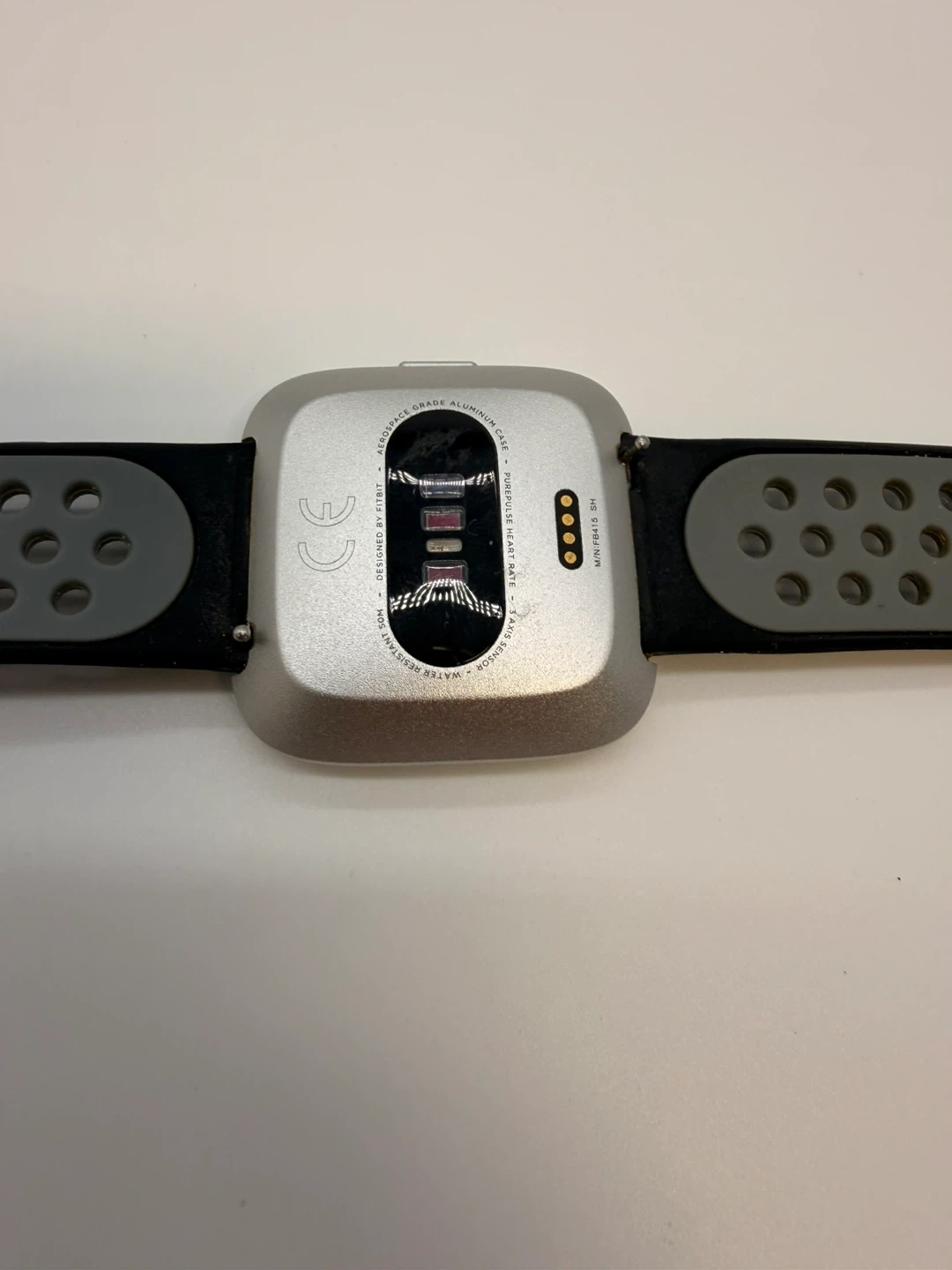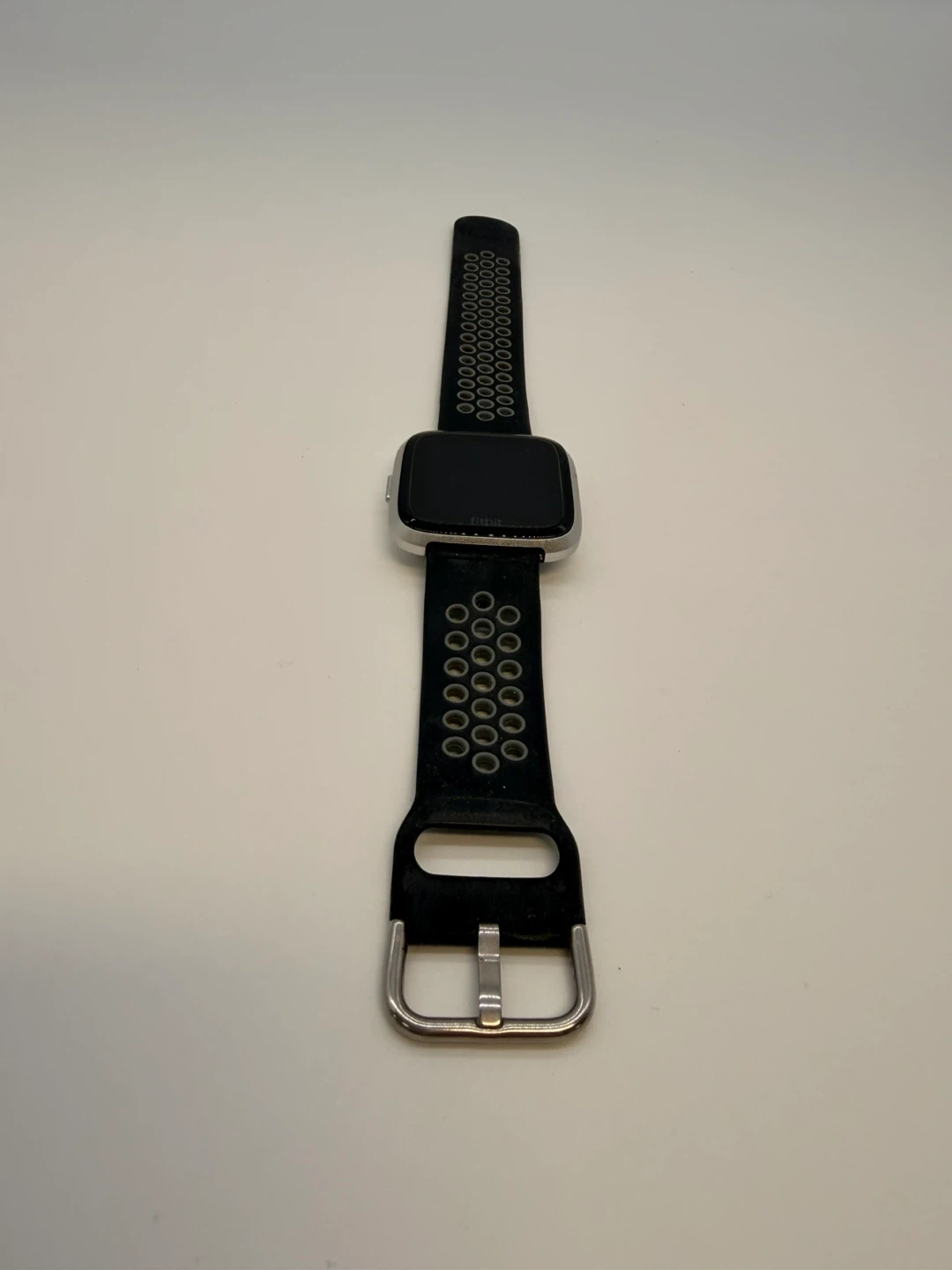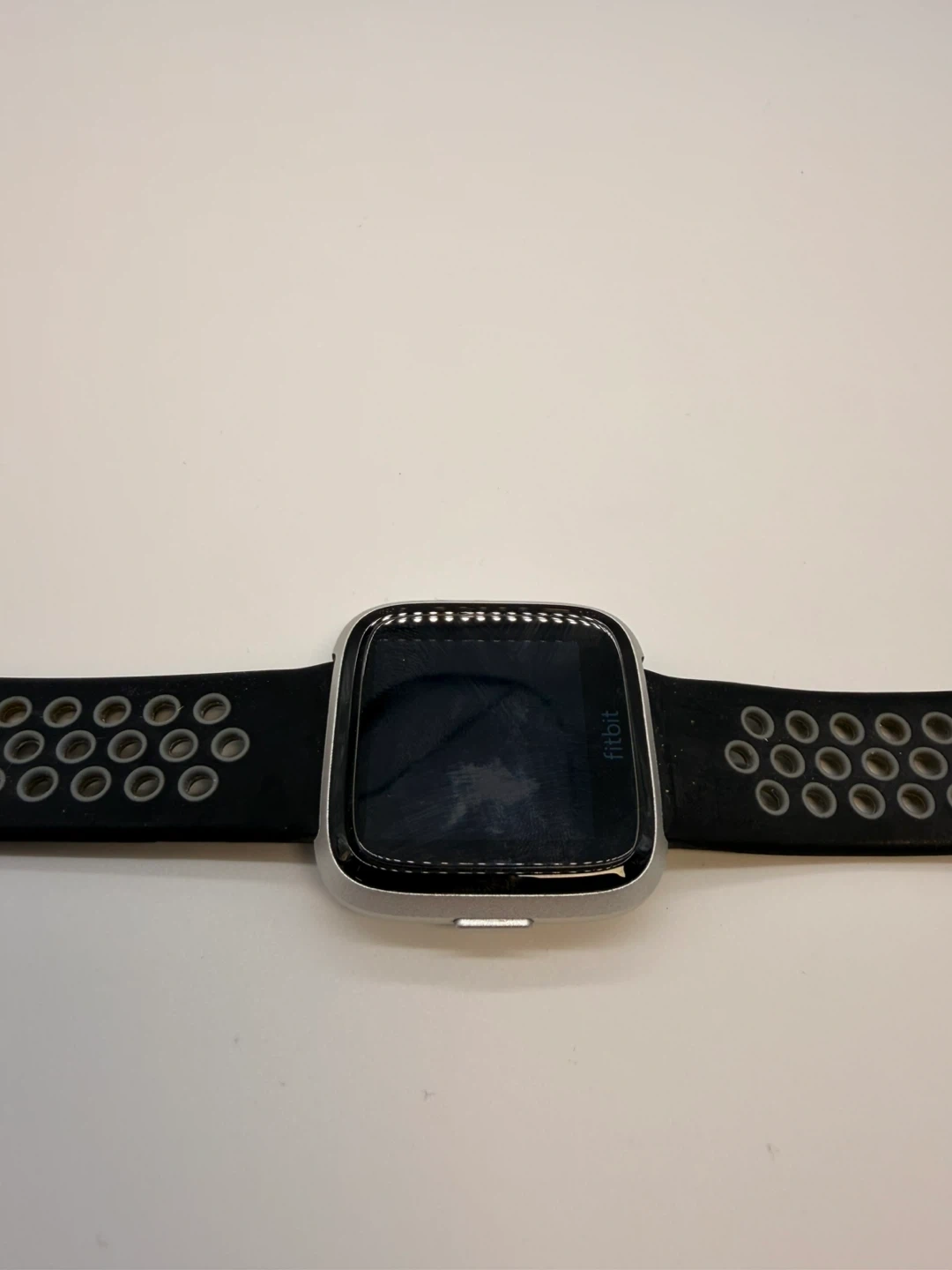 Fitbit Versa smartwatch with a silver aluminium case and a black and grey perforated band. It's water-resistant and tracks heart rate. Includes charging contacts on the back.