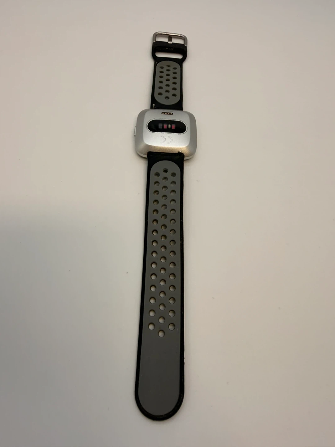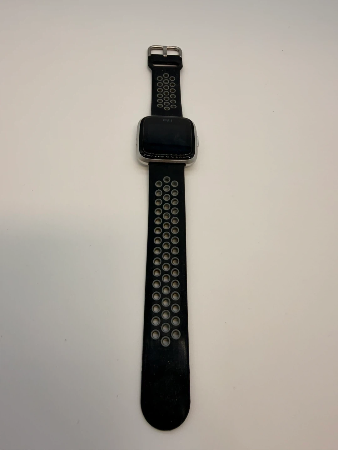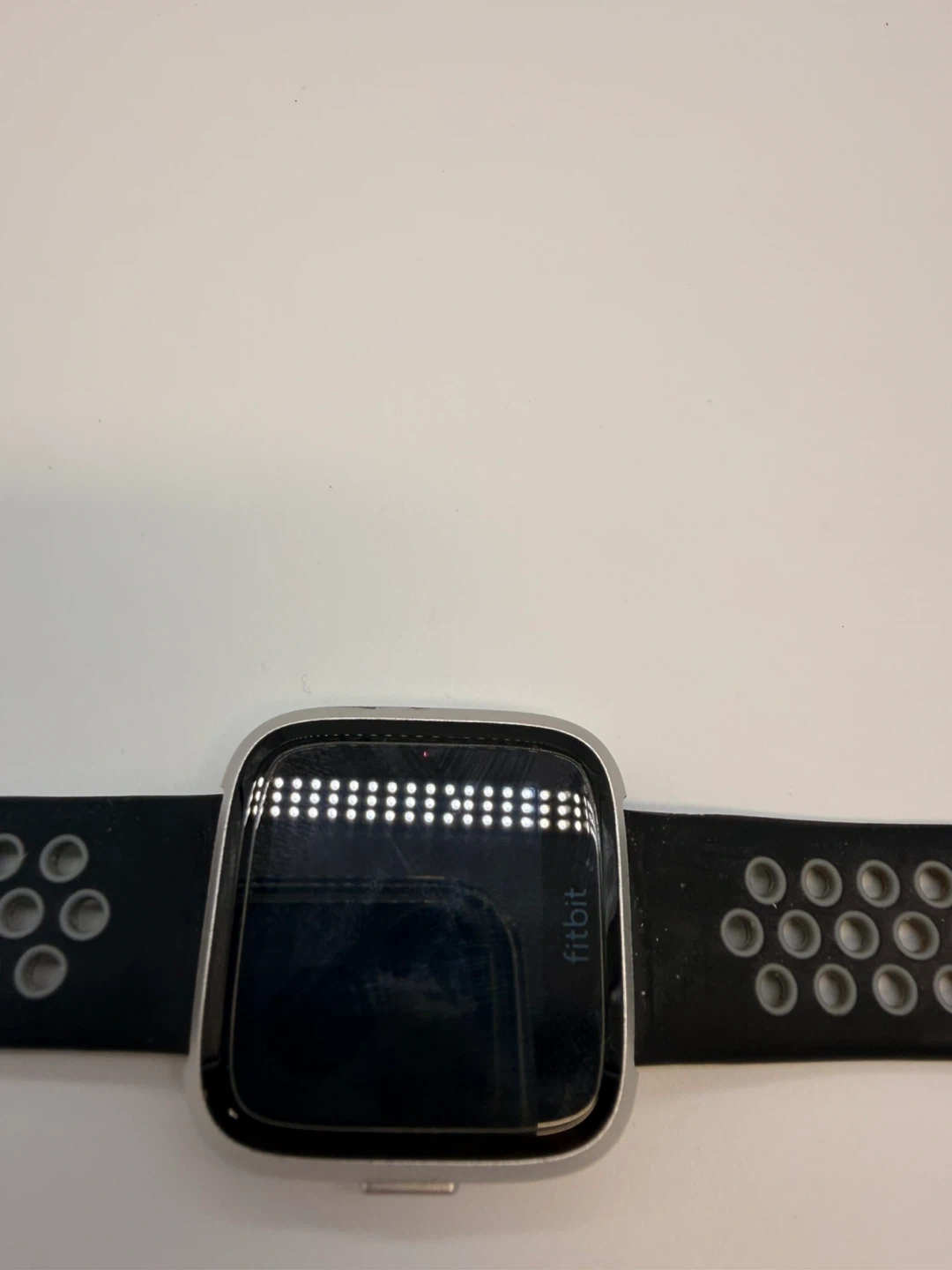 Fitbit Versa smartwatch with a silver aluminium case and a black and grey perforated band. It's water-resistant and tracks heart rate. Includes charging contacts on the back.