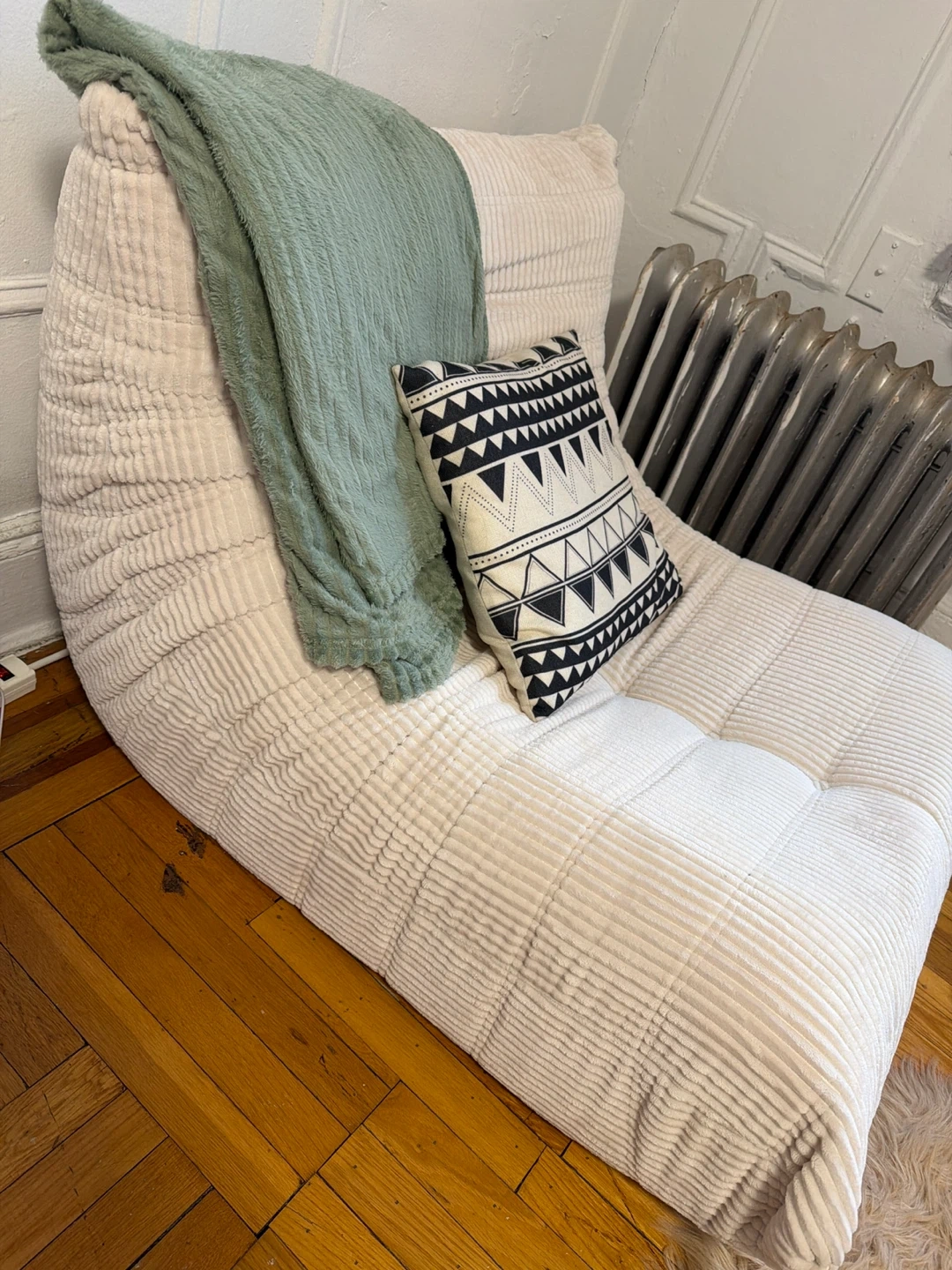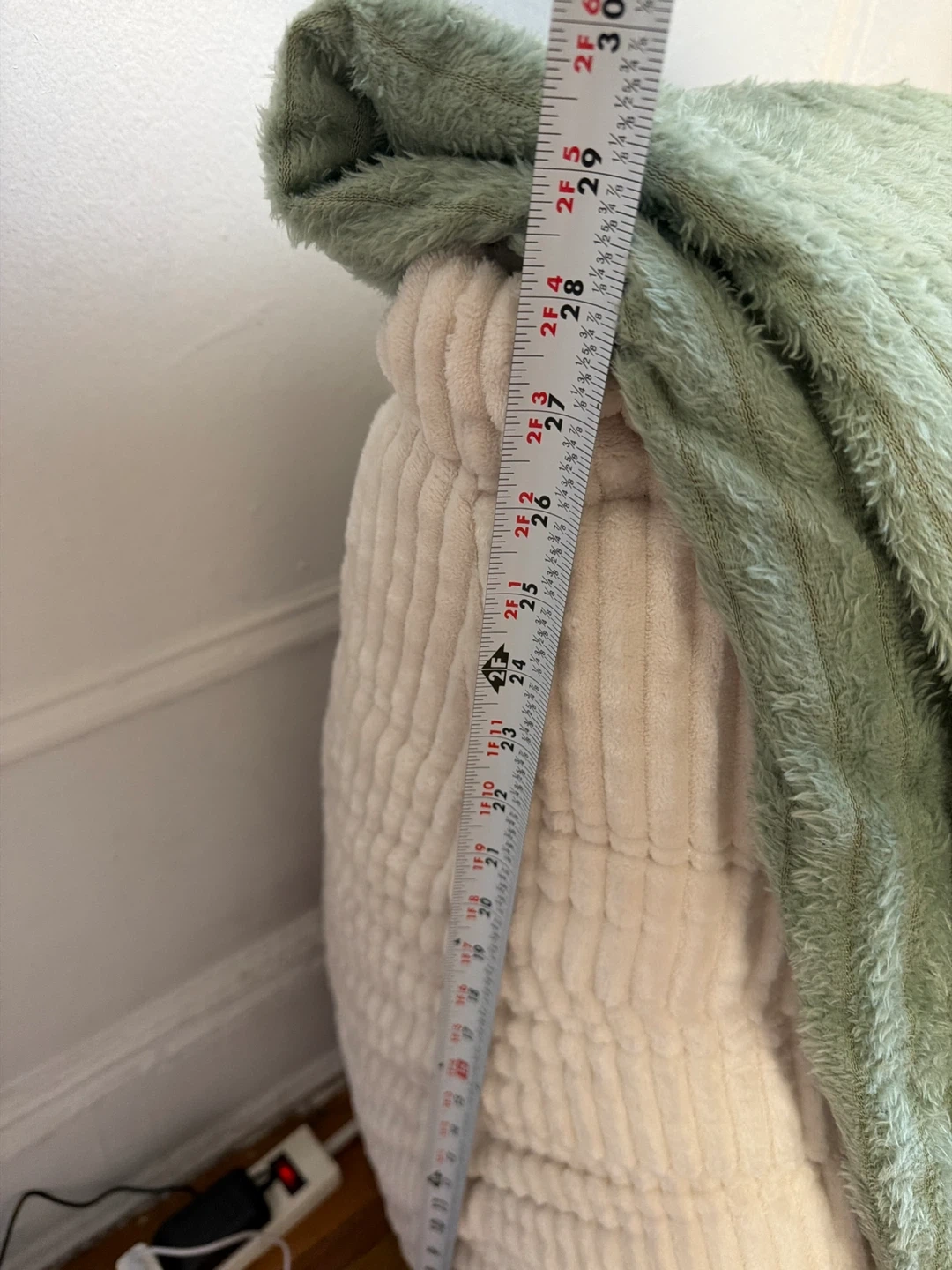 NEEDS TO GO THIS WEEK! This cream-colored bean bag chair features a soft corduroy fabric. The chair measures approximately 29 inches in height when fully propped.