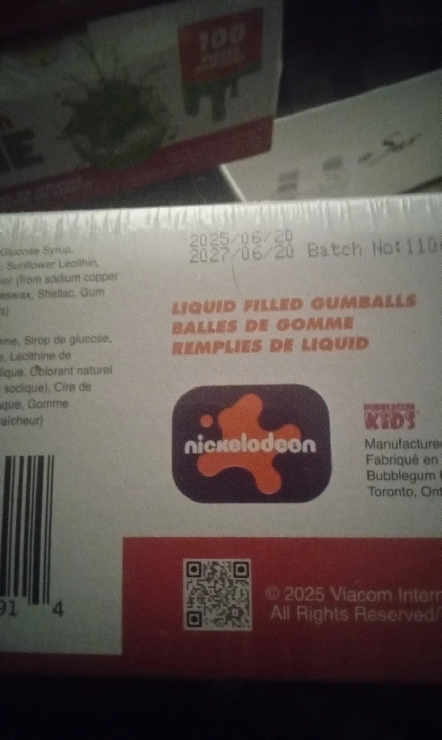 Nickelodeon Slime liquid filled gumballs. Each box contains 100 gumballs. Best by 2025/06/20. Made in Canada. Selling per box 100