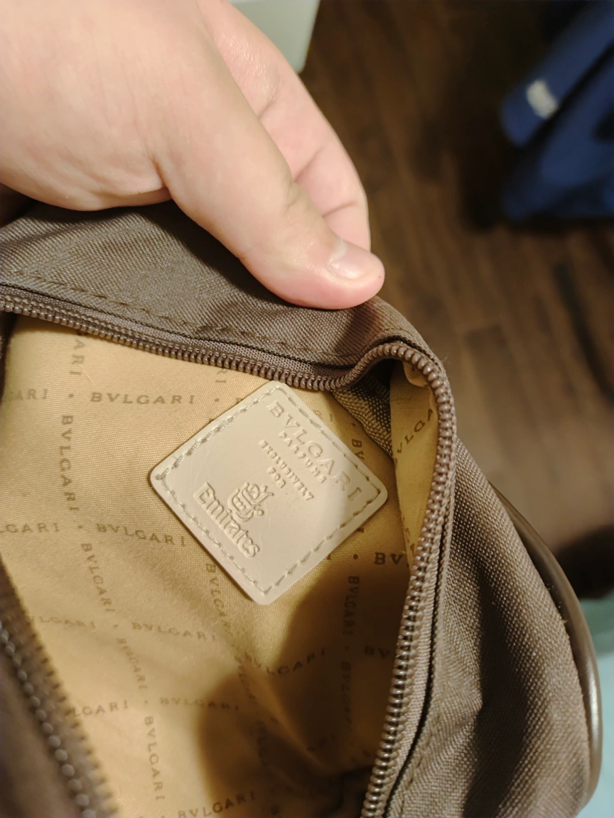 Brown travel kit with beige trim. Features a zipper closure, a leather patch with the Bvlgari logo inside, and a Bvlgari metal tag on the side.It's a giveaway in first class on Emirates.