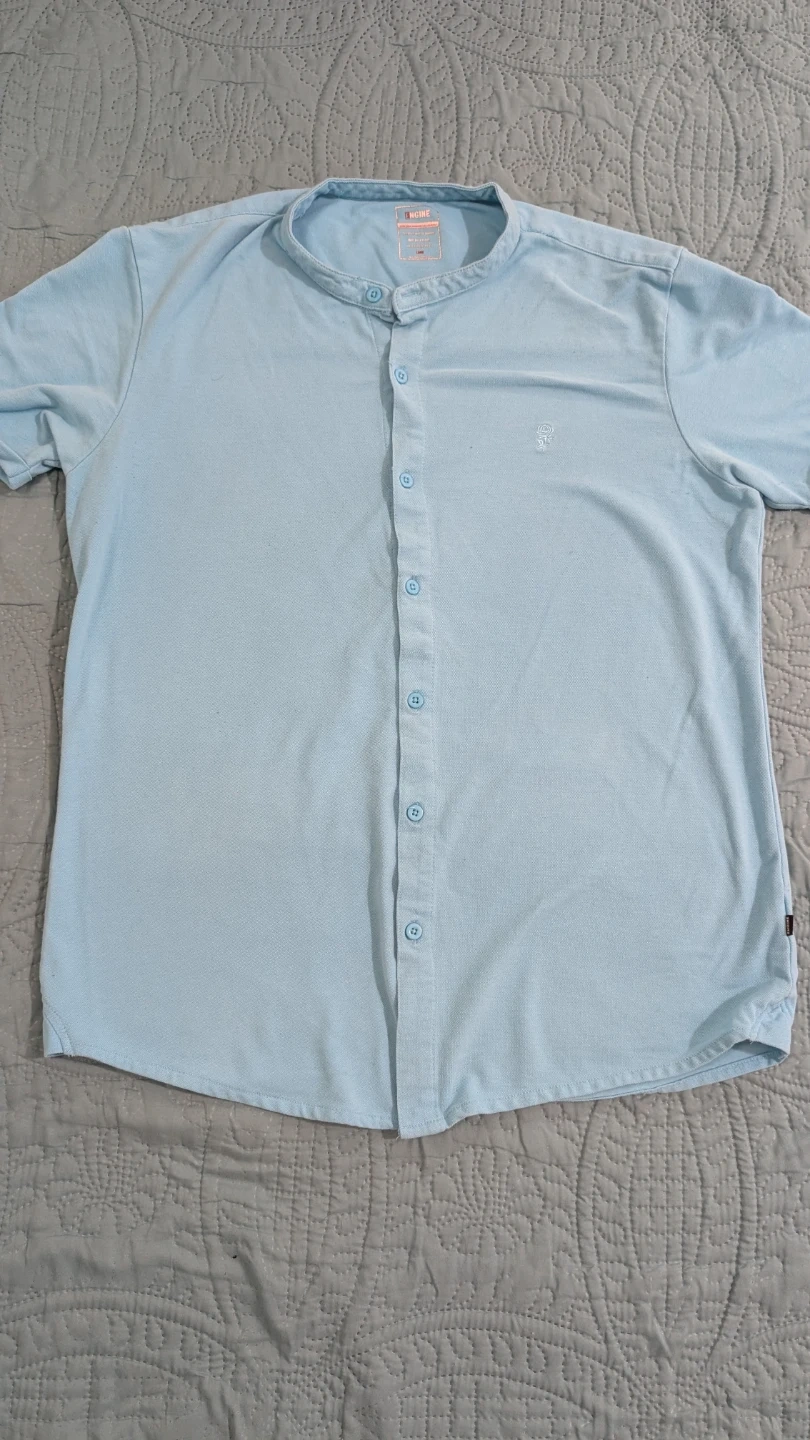 This ENGINE shirt is a light blue colour with a banded collar. It's made of a textured knit fabric. It has a button-up front.