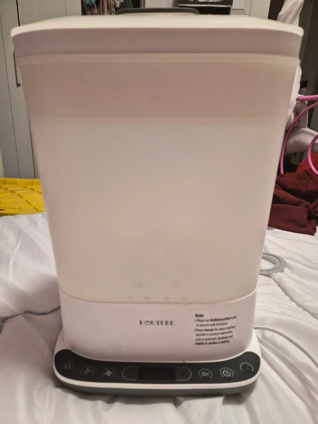 This HUTURE baby bottle sterilizer is great for keeping baby bottles clean and dry. It's a compact unit that uses steam to sterilize and then dries the bottles. The unit has a digital display with timer settings for convenience. This device is perfect for busy parents who need a quick and effective way to sterilize baby bottles.