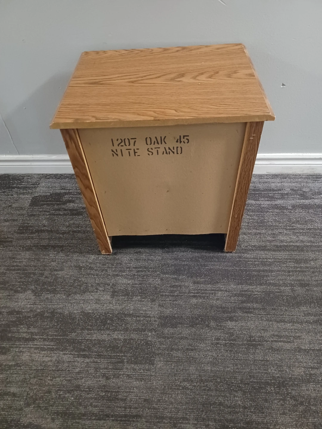 Here's a wooden nightstand with two drawers. It's perfect for keeping your bedside essentials close at hand. The nightstand has a classic design and would look great in any bedroom! Very strong and stable. Few minor bumps and chips almost invisible.