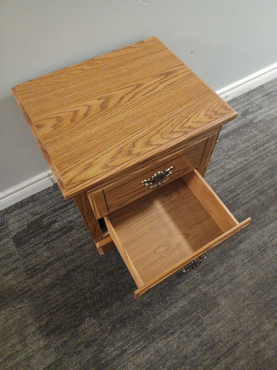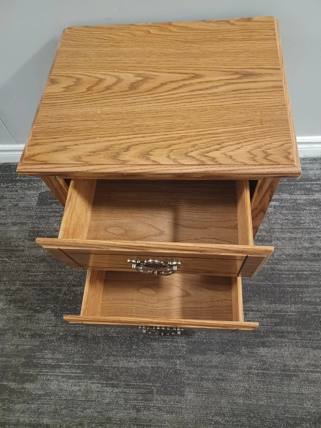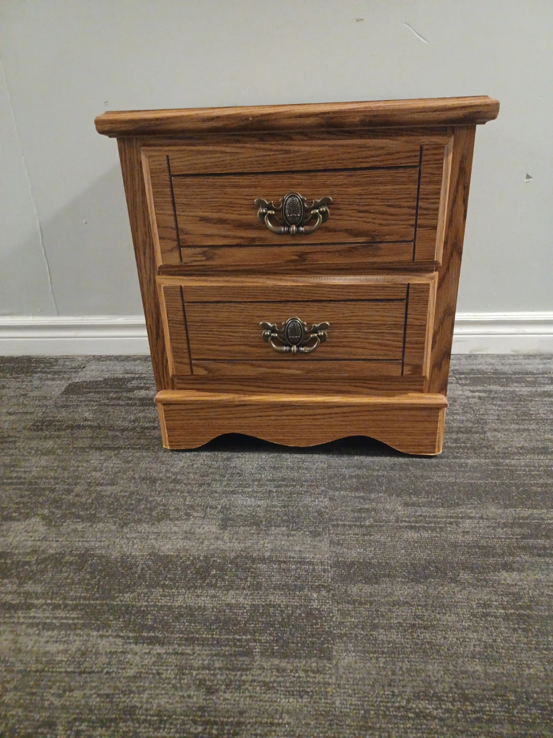 Here's a wooden nightstand with two drawers. It's perfect for keeping your bedside essentials close at hand. The nightstand has a classic design and would look great in any bedroom! Very strong and stable. Few minor bumps and chips almost invisible.