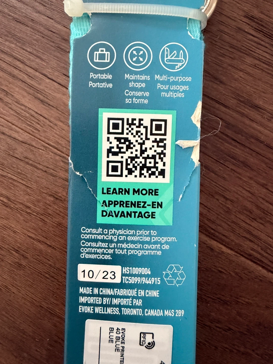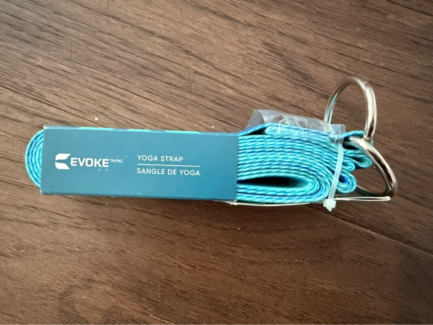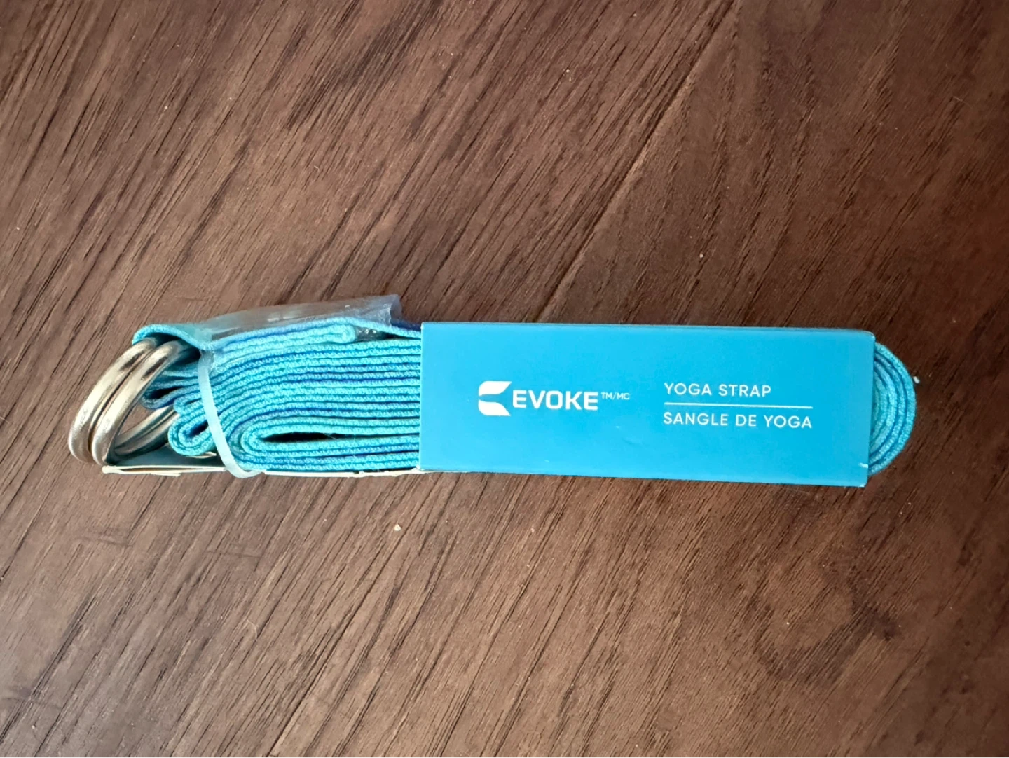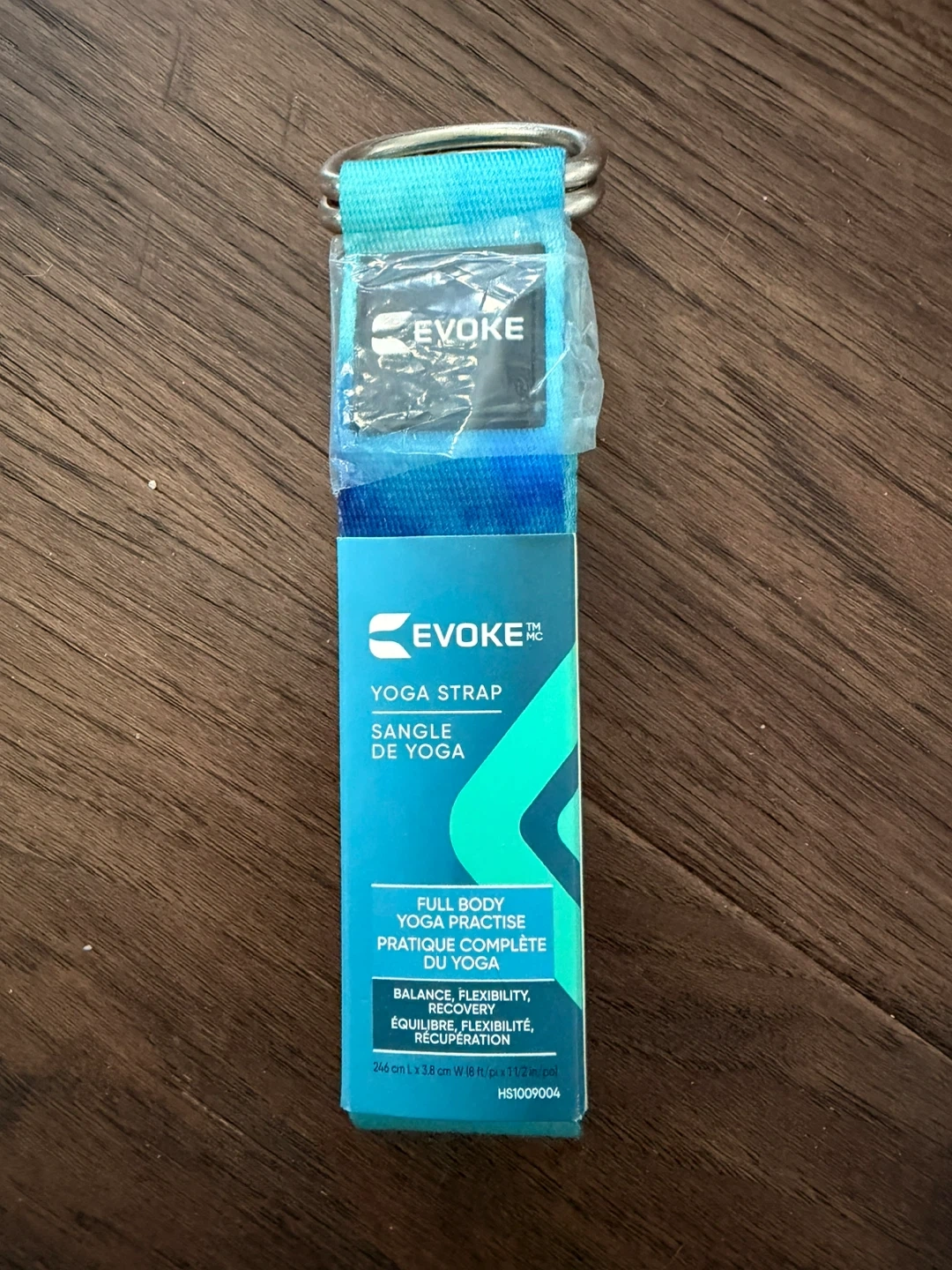 EVOKE yoga strap in blue. It's 246 cm long and 3.8 cm wide. Portable and multi-purpose for various exercises.
