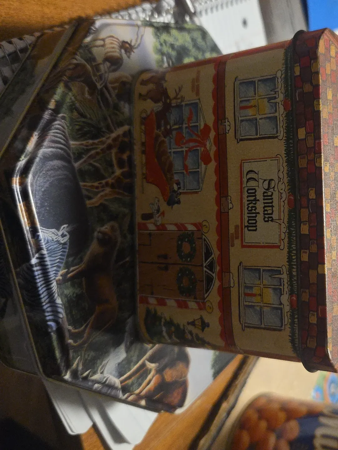It's a festive tin featuring a charming Santa's Workshop design. The inside shows a wild animal scene. It's perfect for storing holiday treats or keepsakes!