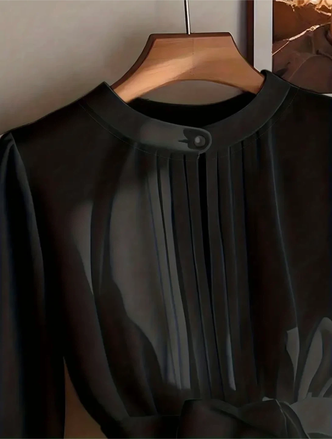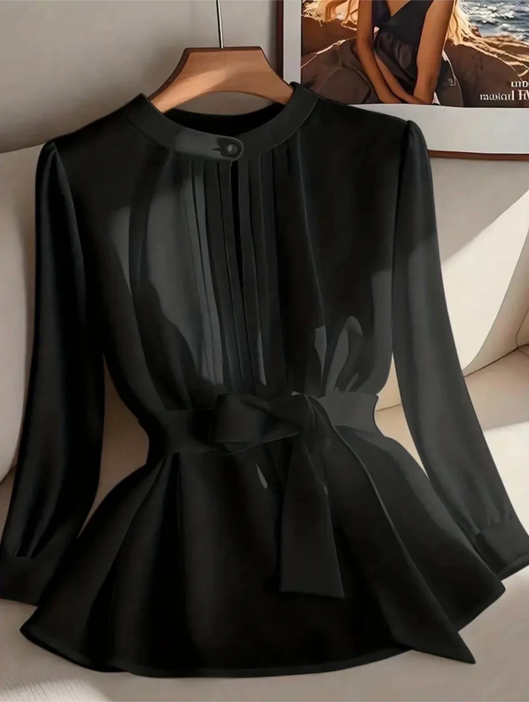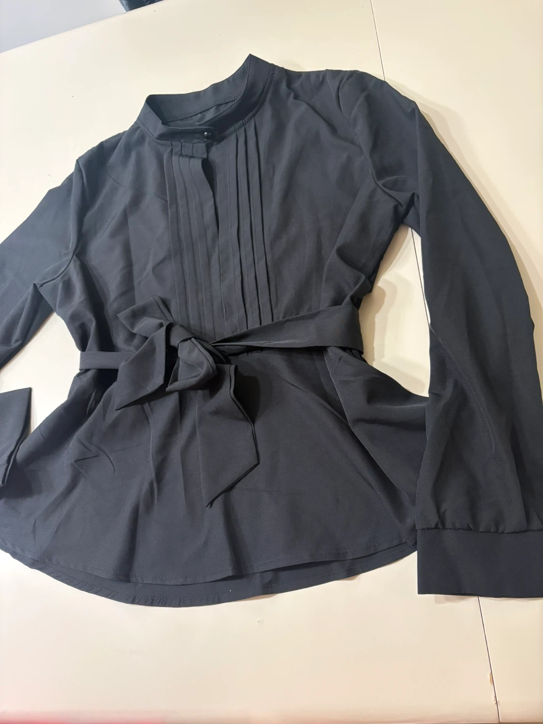 A chic black long-sleeve blouse. It features elegant pleating down the front and a matching tie belt at the waist. The fabric looks like a lightweight chiffon.