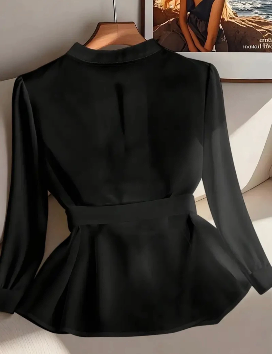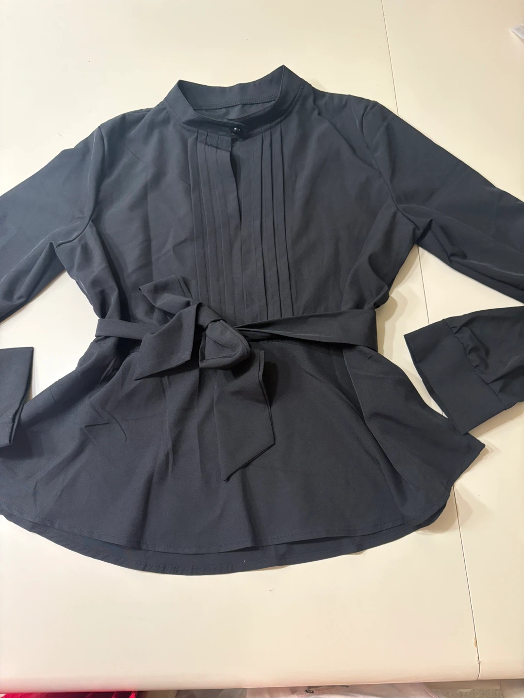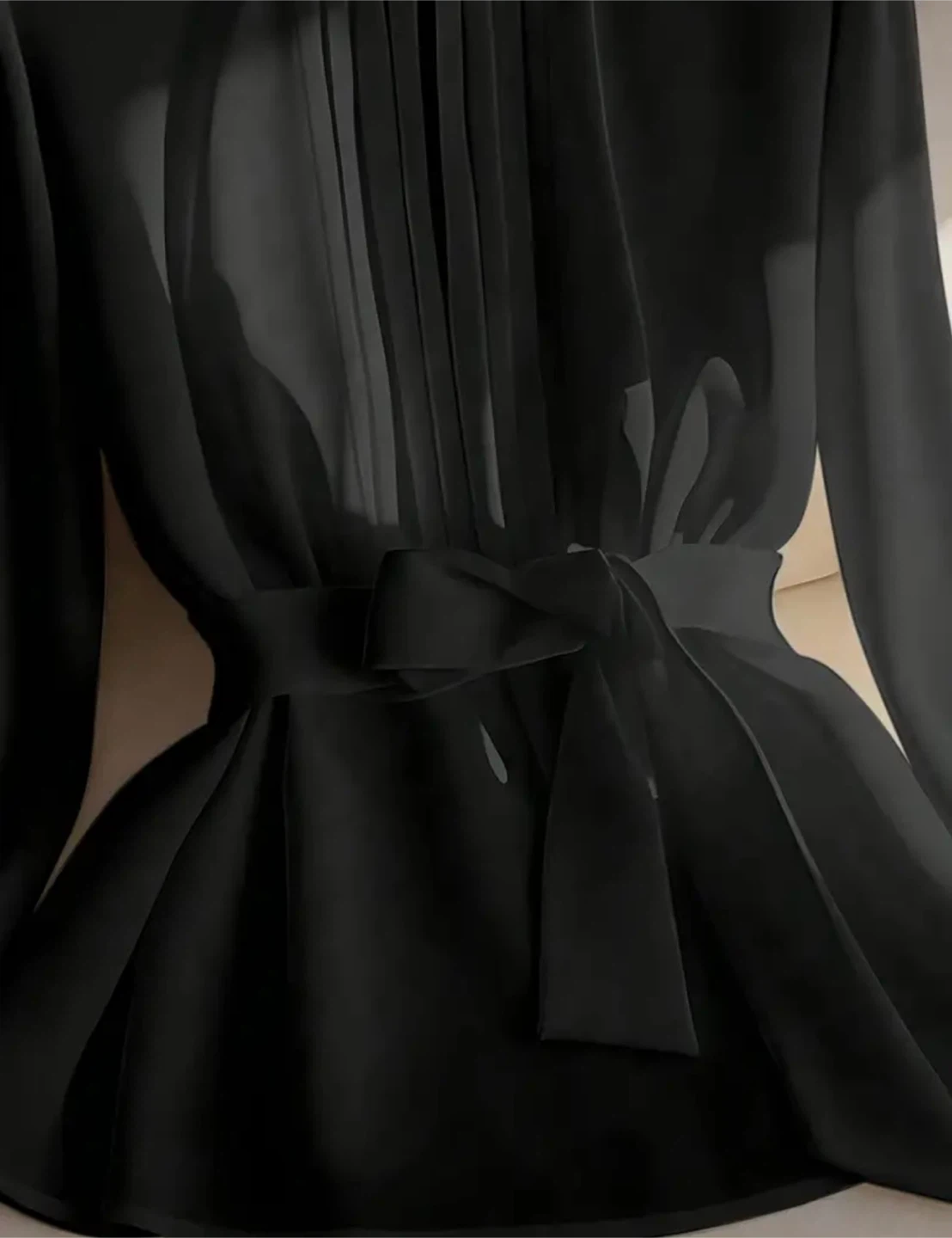 A chic black long-sleeve blouse. It features elegant pleating down the front and a matching tie belt at the waist. The fabric looks like a lightweight chiffon.