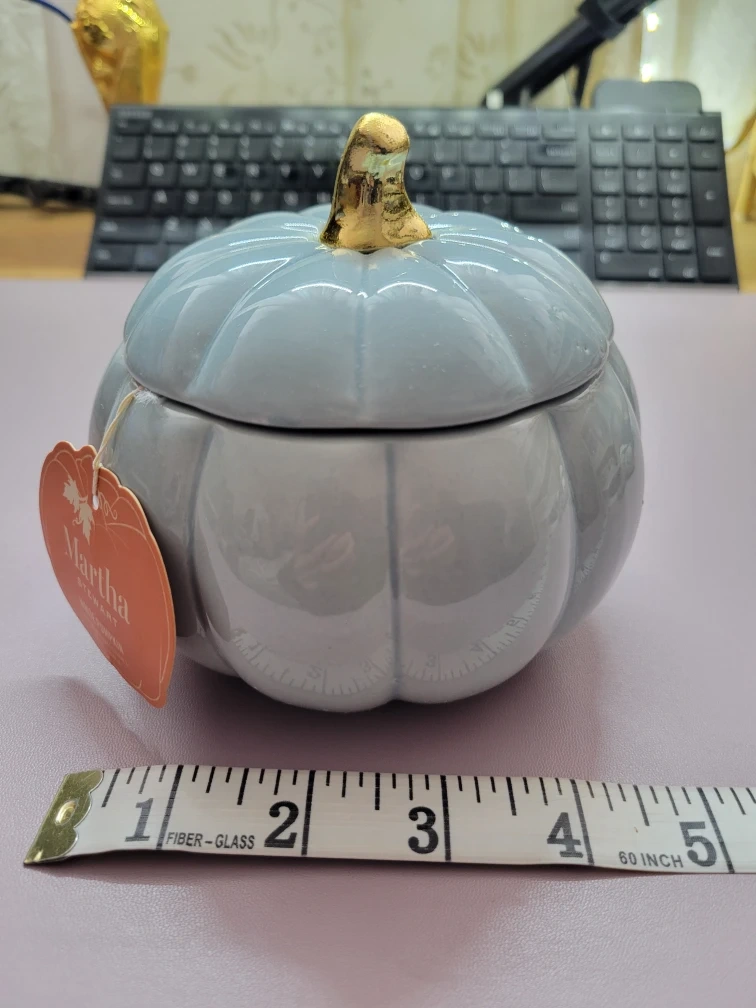 Selling a lovely Martha Stewart White Pumpkin soy blend candle! It's in great condition and ready to fill your space with a cozy autumn scent. The candle comes in a cute pumpkin-shaped ceramic container with a lid, perfect for adding a touch of seasonal charm to your decor. Smoke-free home.