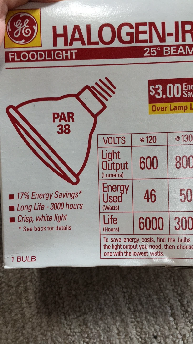 Selling a GE Halogen-IR Floodlight, PAR38. The box says it has 17% energy savings and a long life of 3000 hours. It provides a crisp, white light. The light output is 600 lumens at 120 volts and 800 lumens at 130 volts. Energy used is 46 watts at 120 volts and 50 watts at 130 volts. The life is 6000 hours at 120 volts and 3000 hours at 130 volts