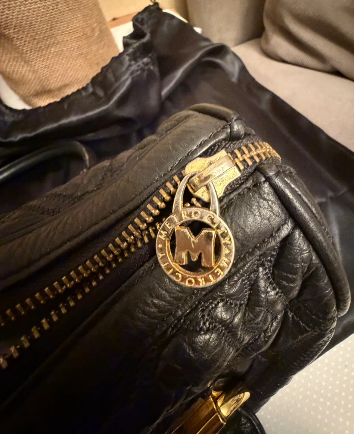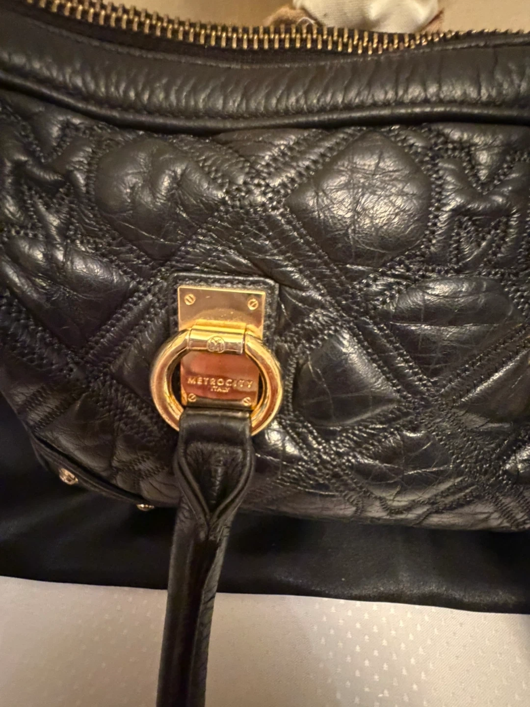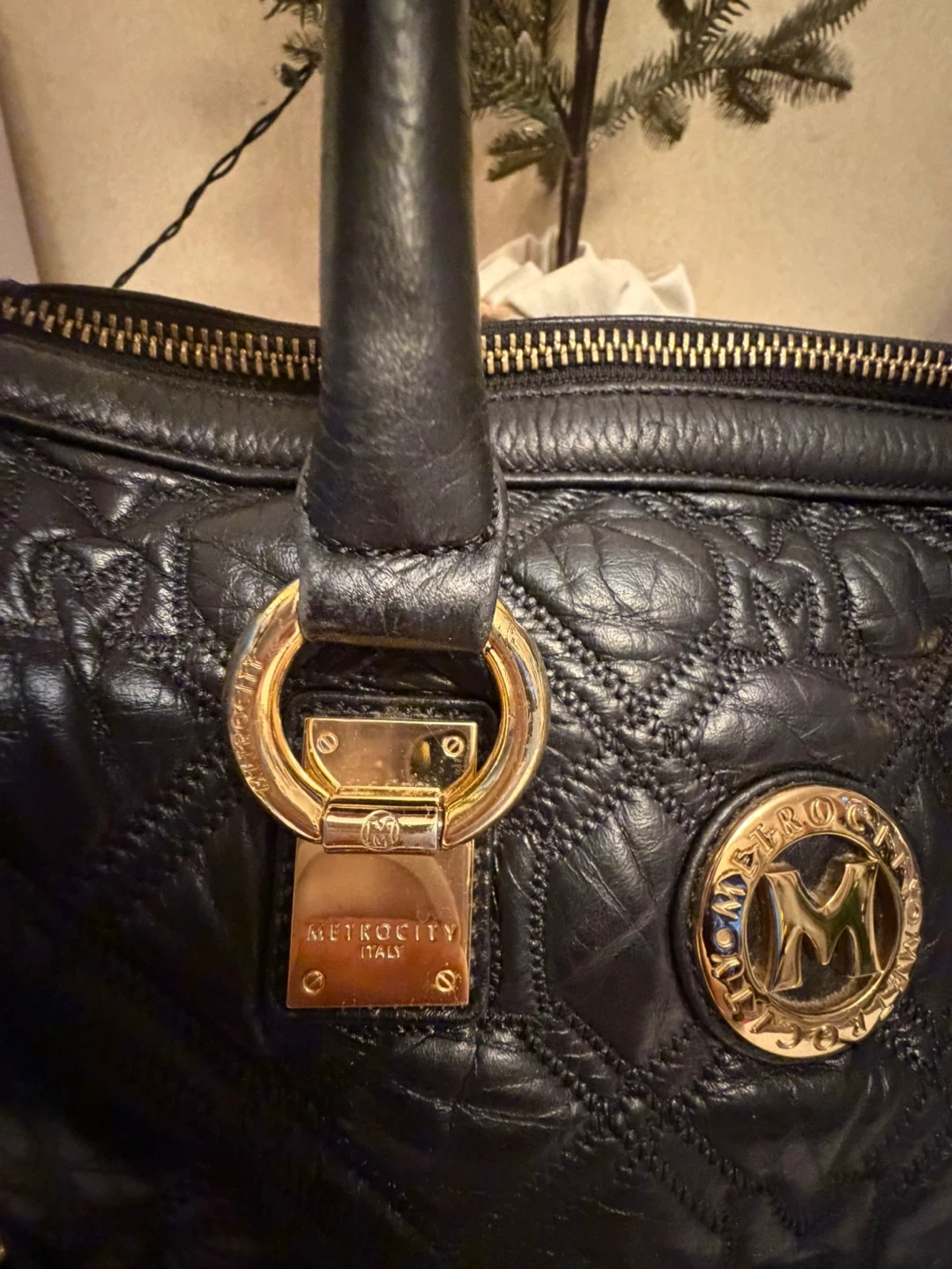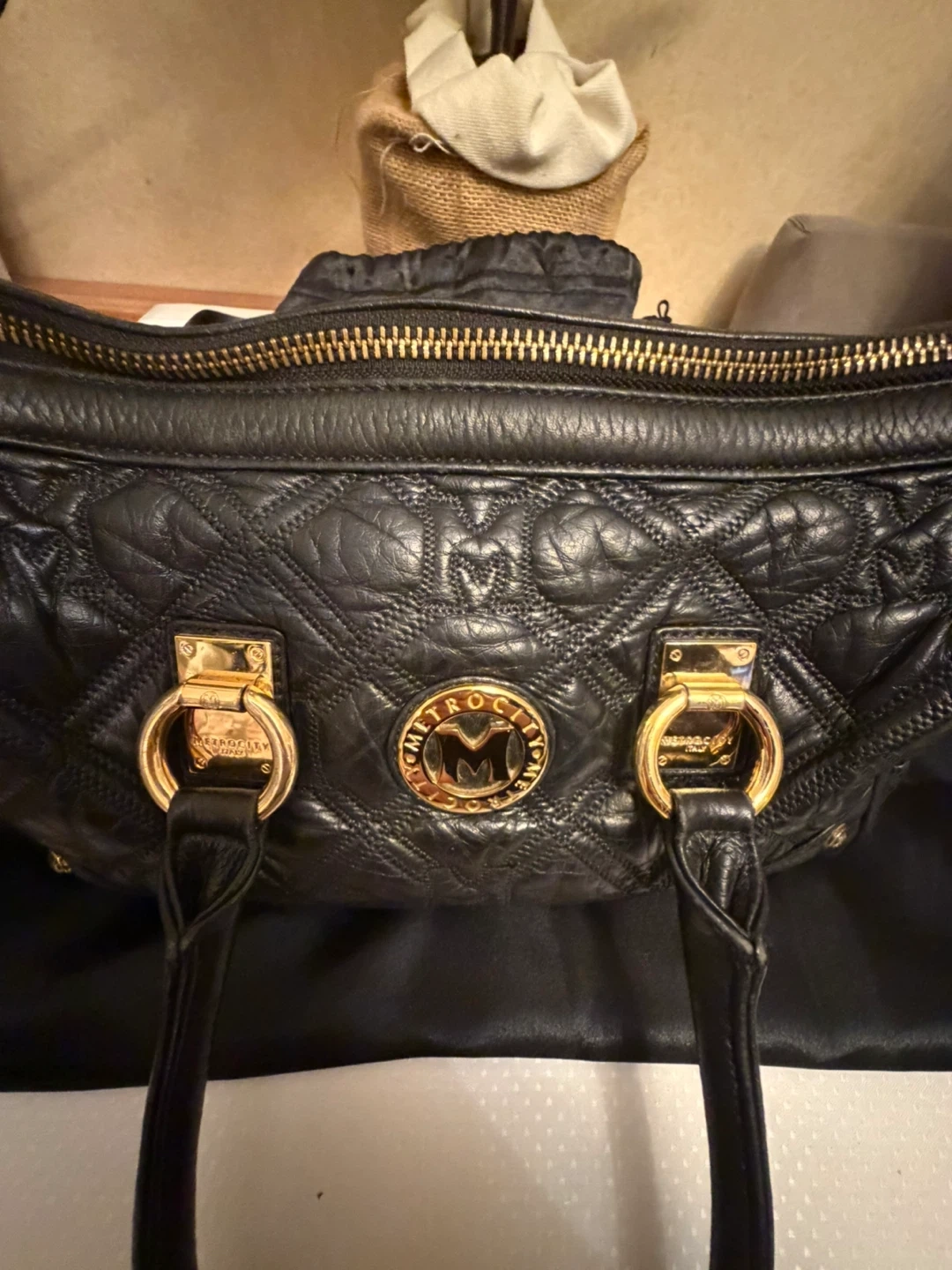 This is a METROCITY Italy handbag in black leather. It features gold hardware and a quilted design. It's in great condition and ready for a new owner! Comes from a smoker household .