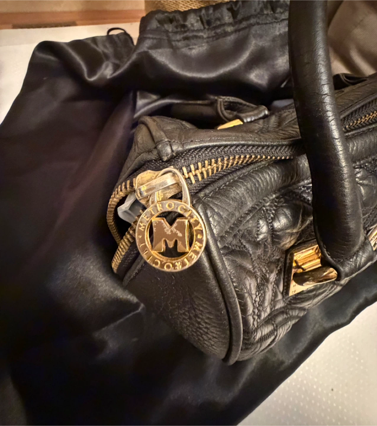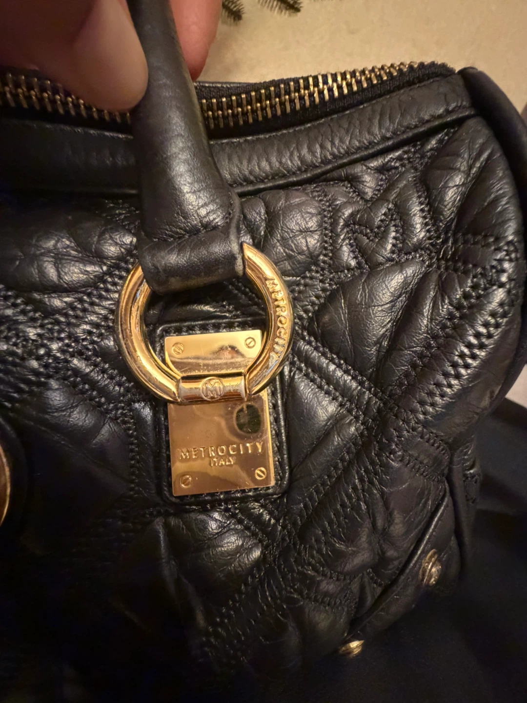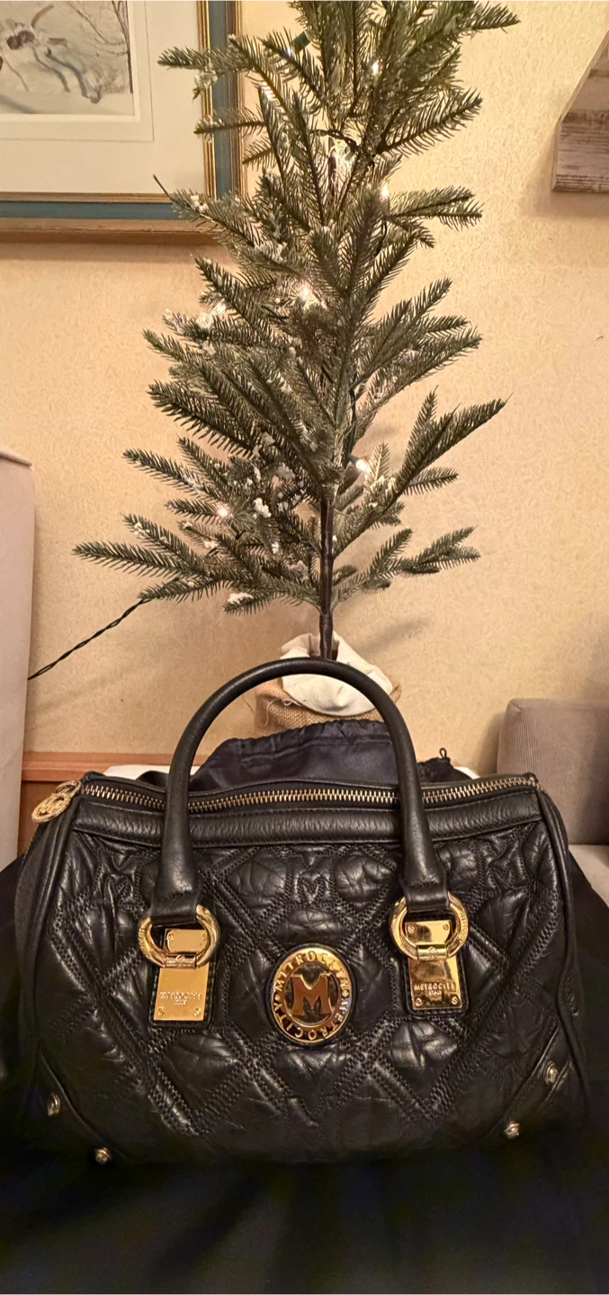 This is a METROCITY Italy handbag in black leather. It features gold hardware and a quilted design. It's in great condition and ready for a new owner! Comes from a smoker household .