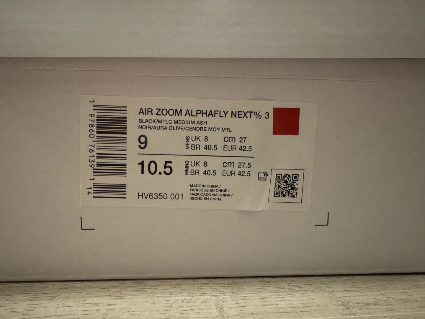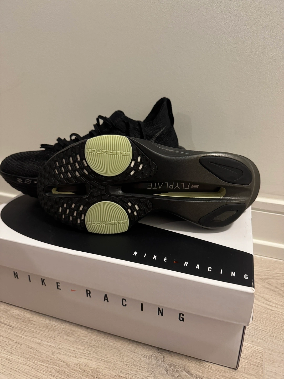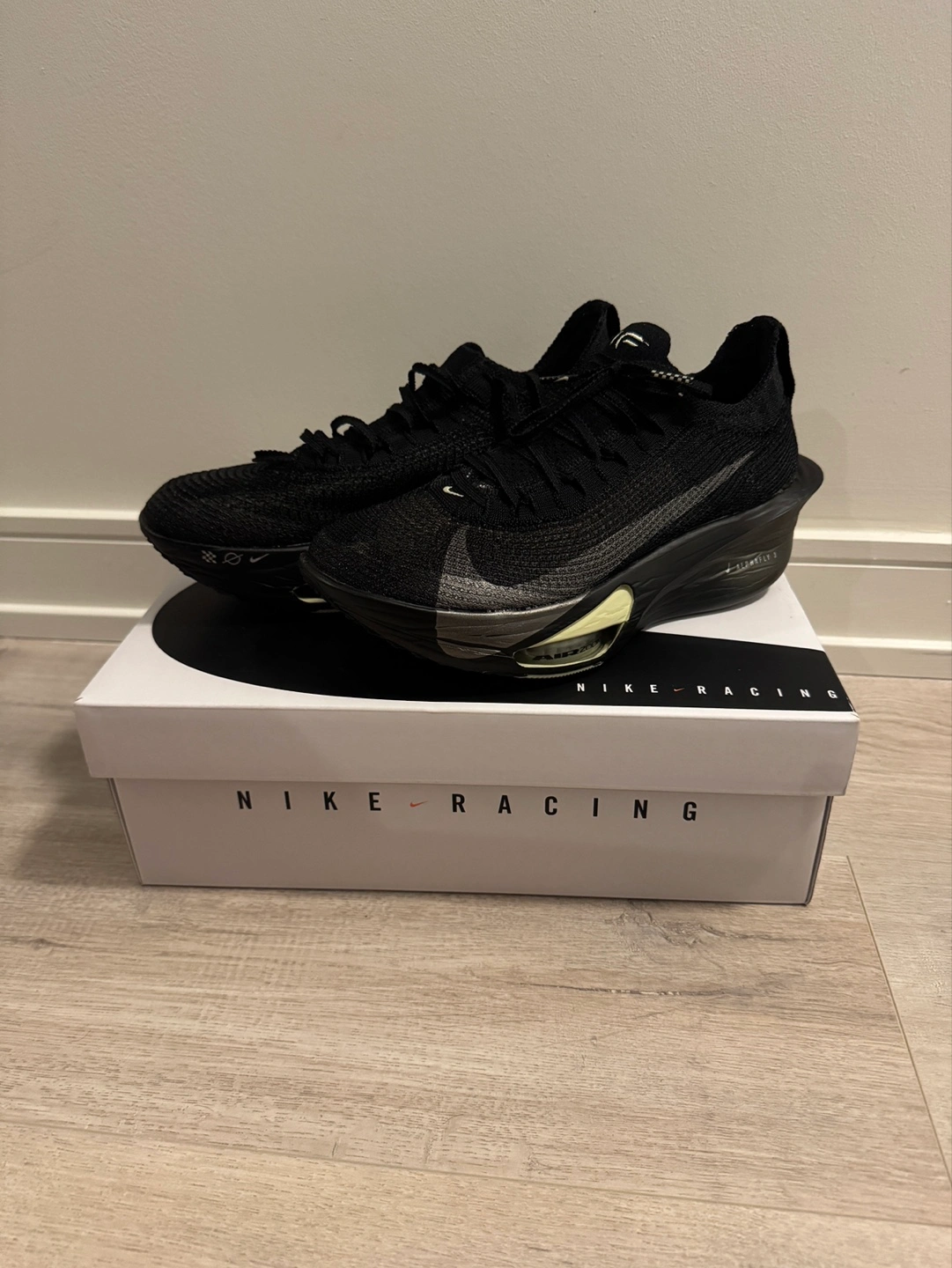 Original price 410 plus tax. 50 dollars plus tax off. Nike Air Zoom Alphafly Next% 3 running shoes. Black colourway. Size 9. New in box.