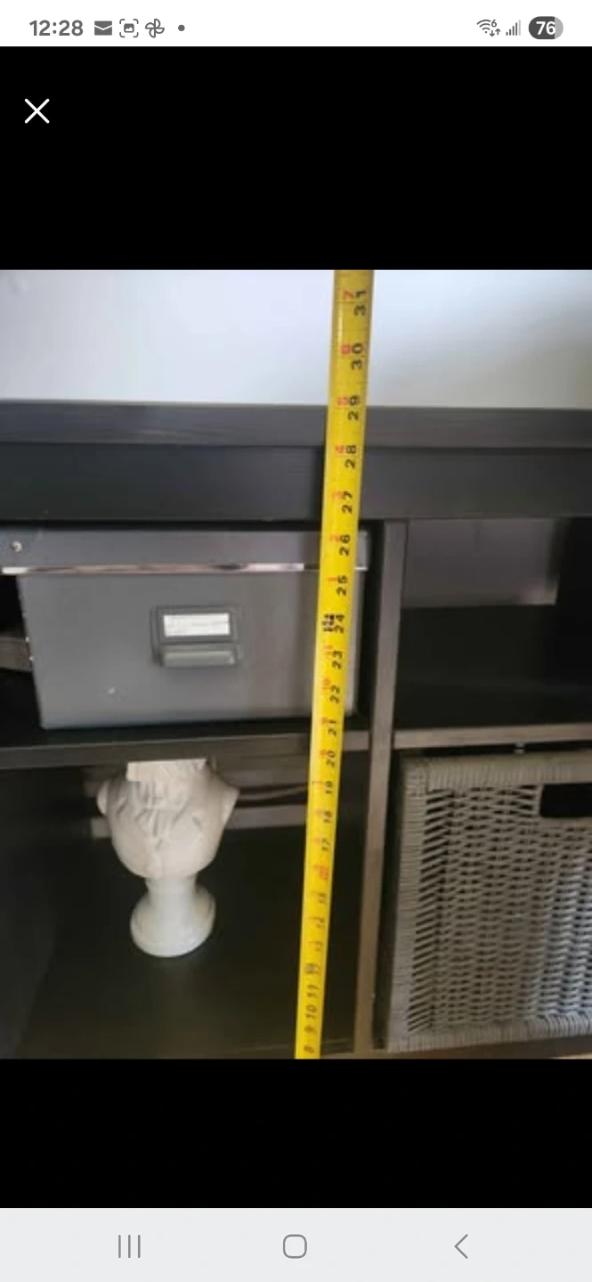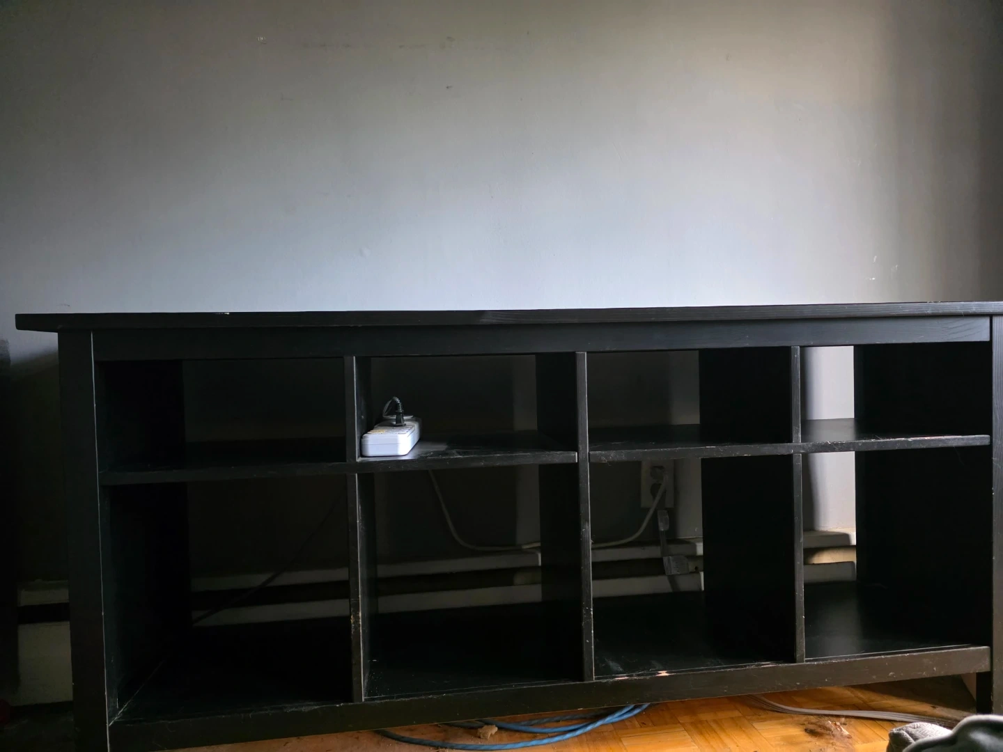 Selling a black shelf unit. It has some scratches on the top surface, as shown in the pictures. The unit measures approximately 31 inches in height and 17 inches in depth.