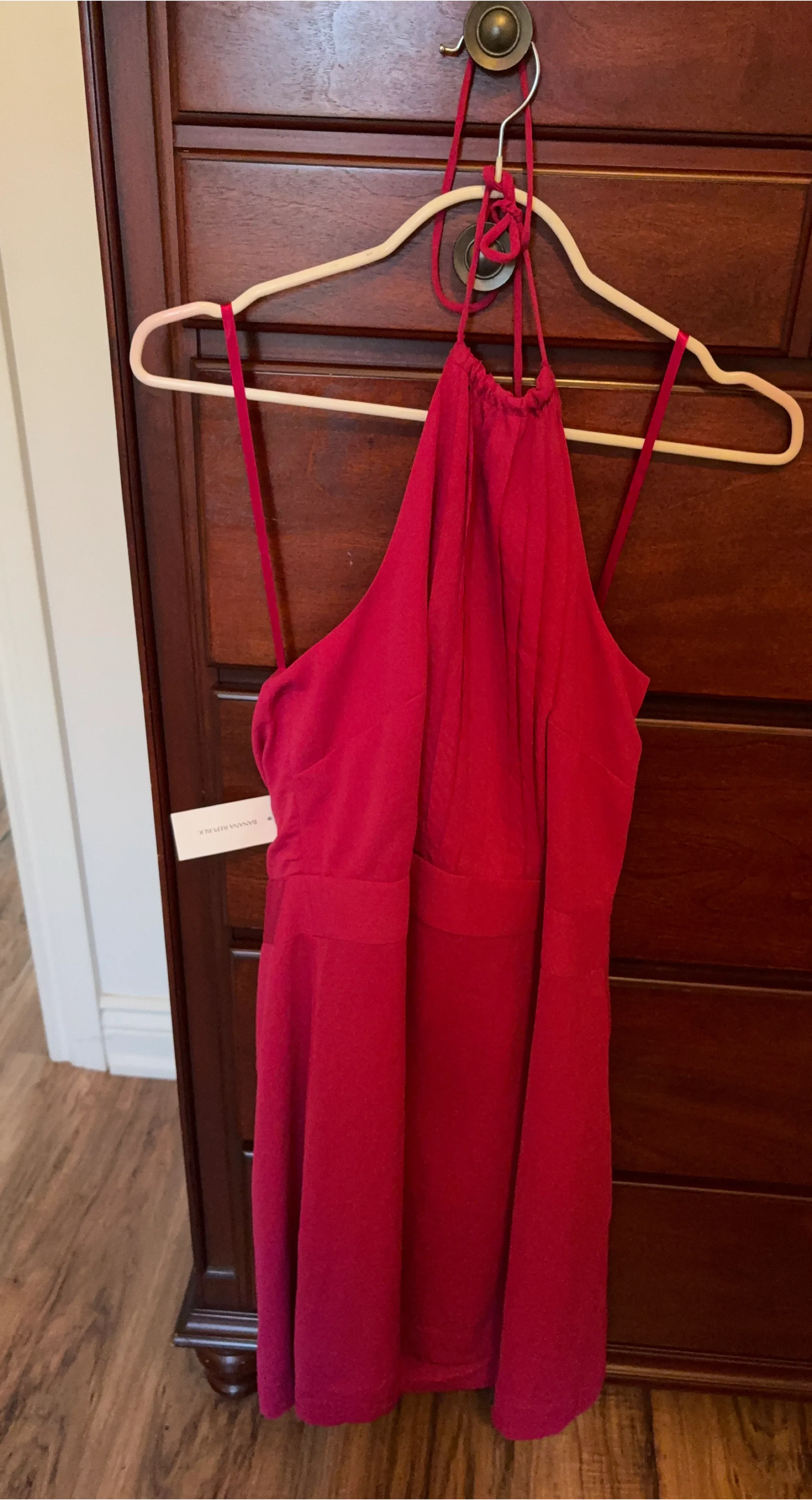 This is a red Banana Republic halter dress. It's made of a lightweight fabric. The dress has a tie halter neckline.