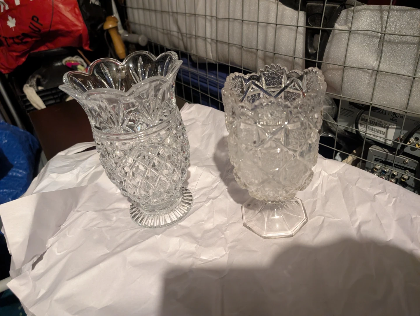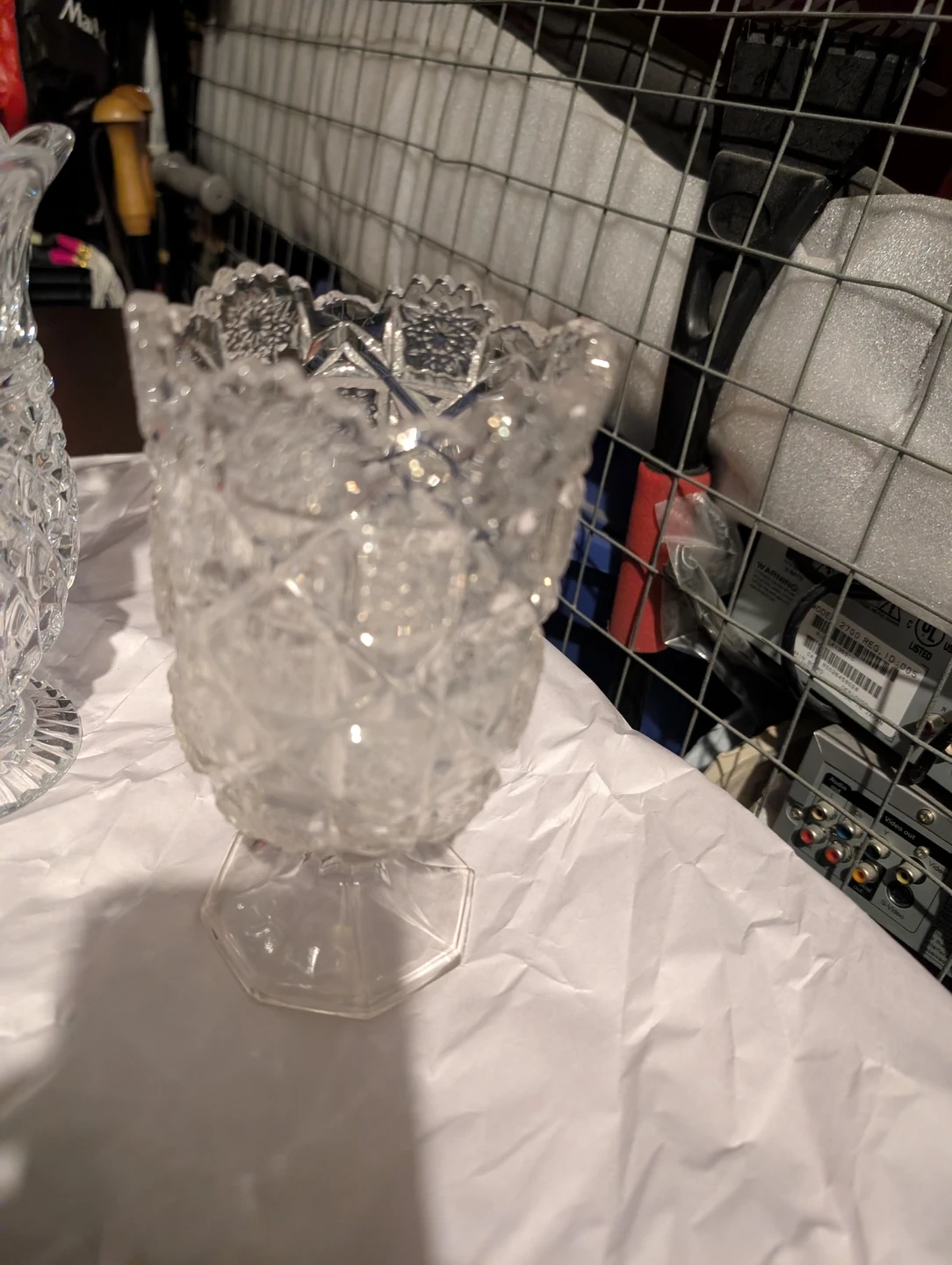 Beautiful clear crystal glass vase with intricate diamond and fan pattern detailing. It has a scalloped rim and a sturdy octagonal base. Perfect for displaying flowers or as a decorative piece!