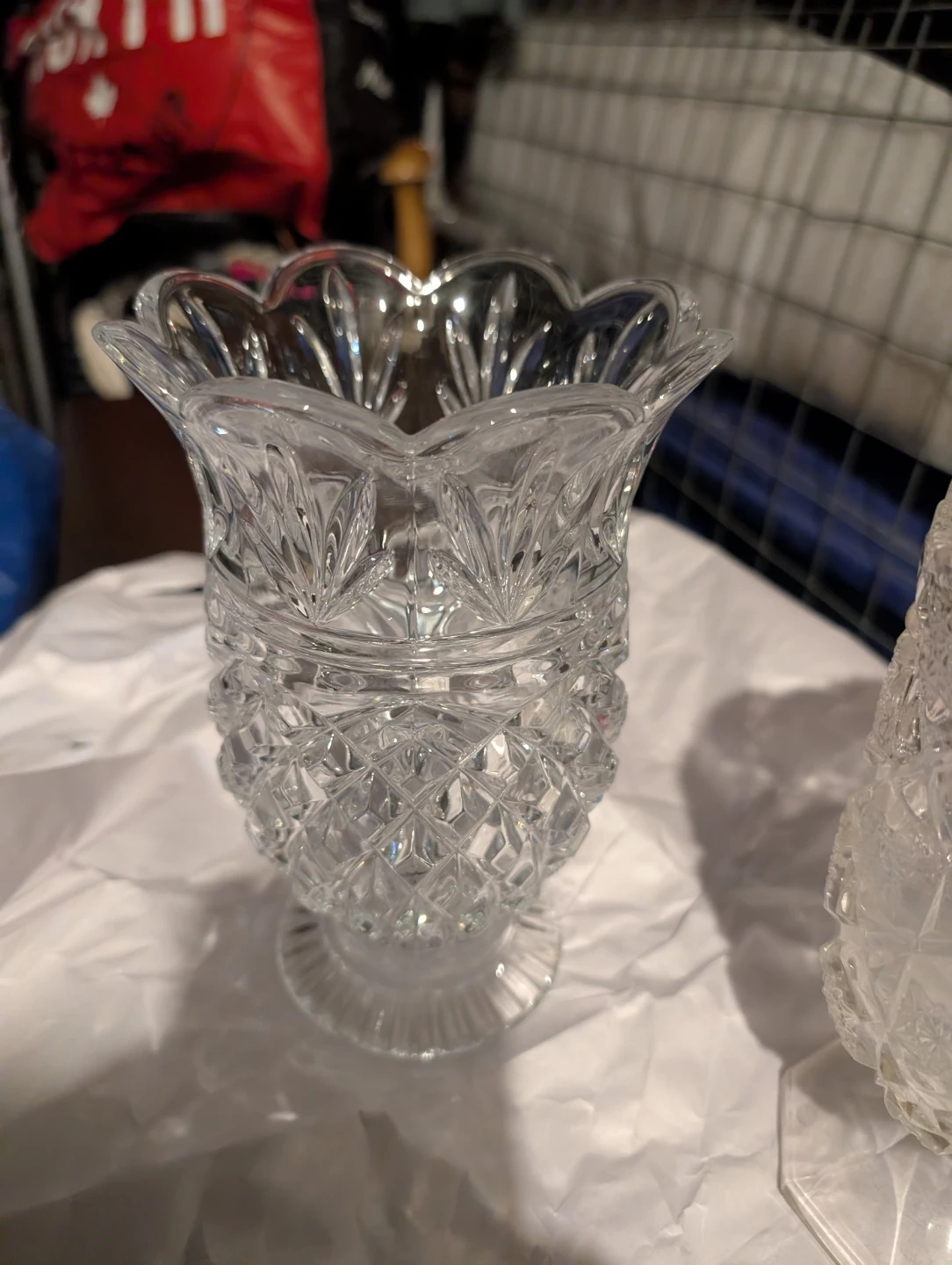 Beautiful clear crystal glass vase with intricate diamond and fan pattern detailing. It has a scalloped rim and a sturdy octagonal base. Perfect for displaying flowers or as a decorative piece!