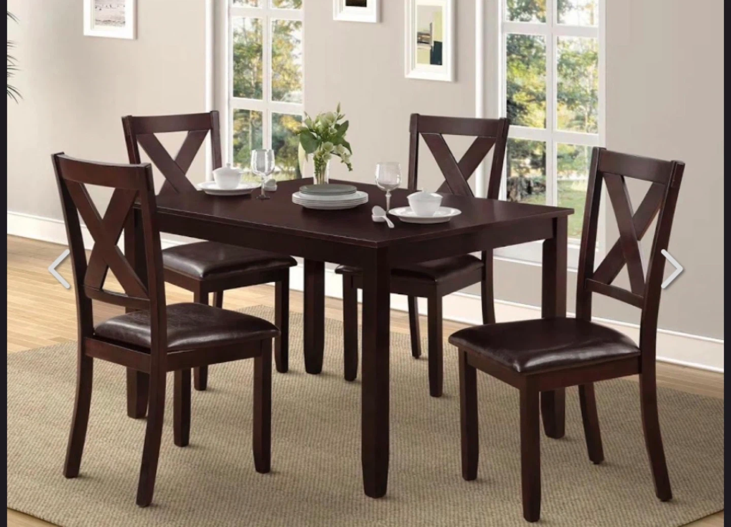 A dark brown dining set featuring a rectangular table and four chairs with padded seats. The chairs have a distinctive cross-back design. This set is perfect for a family dinner or gathering friends.