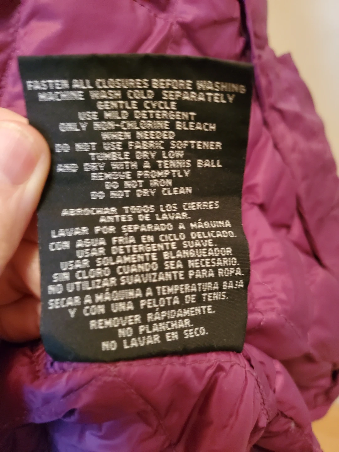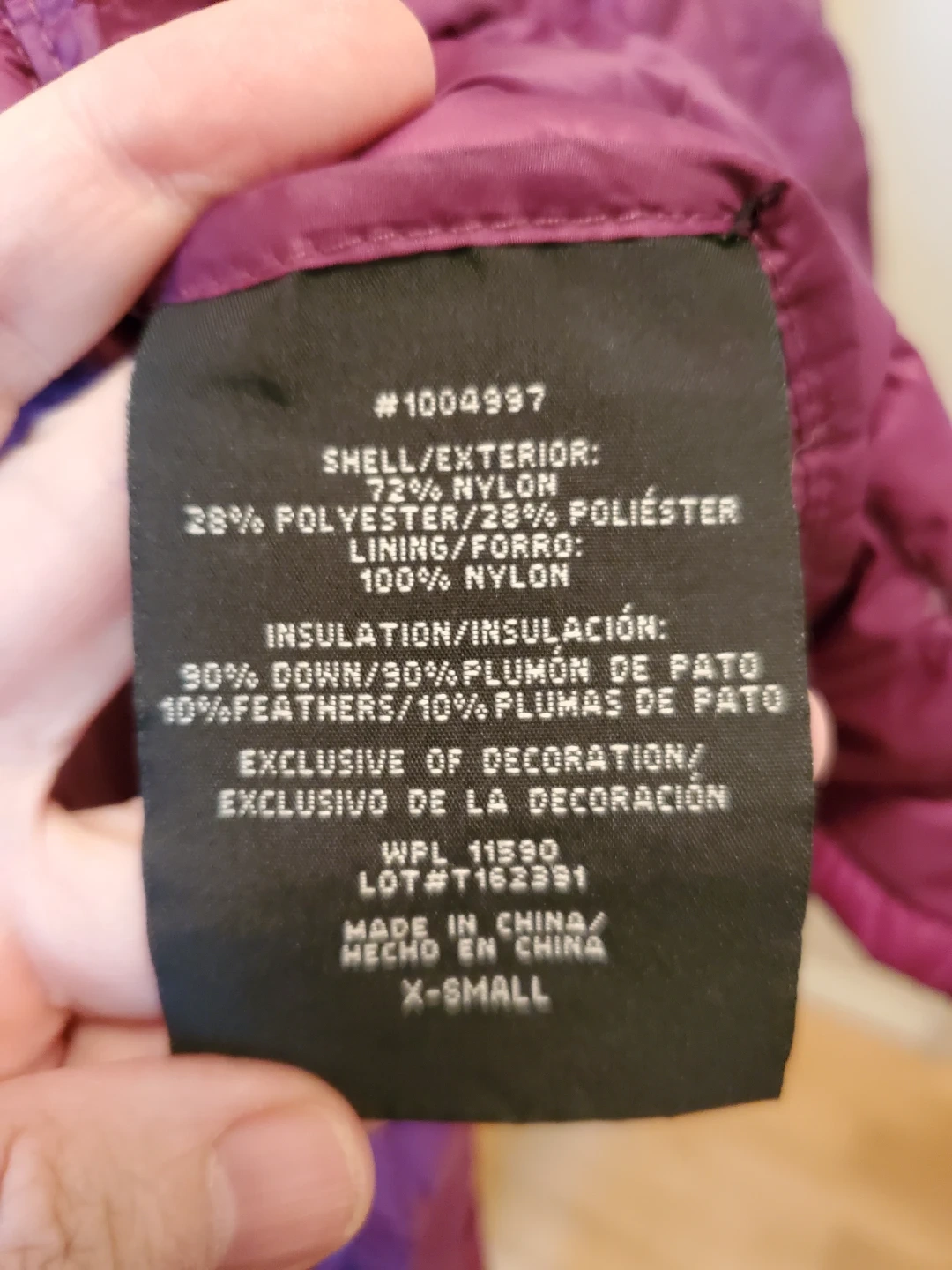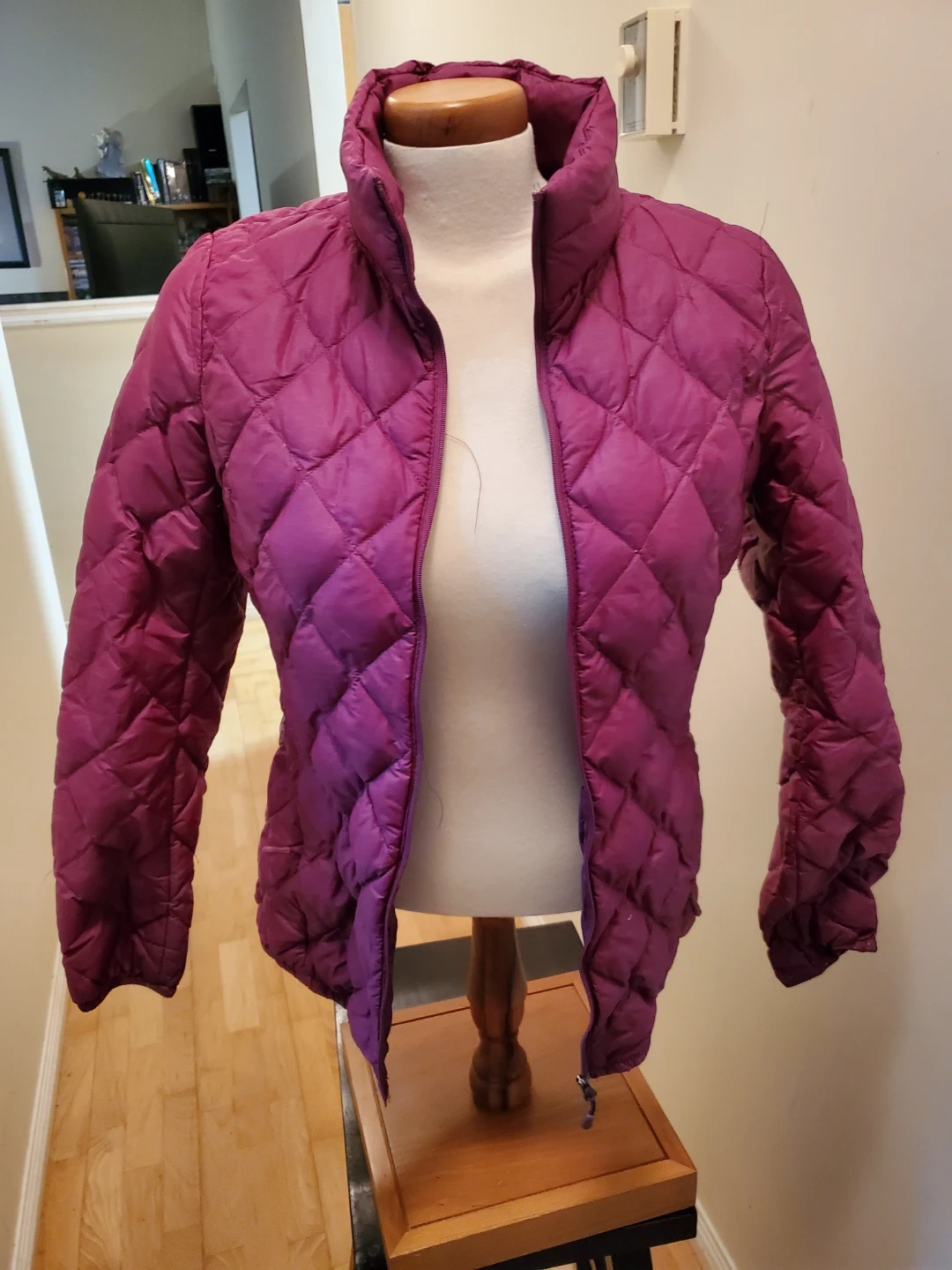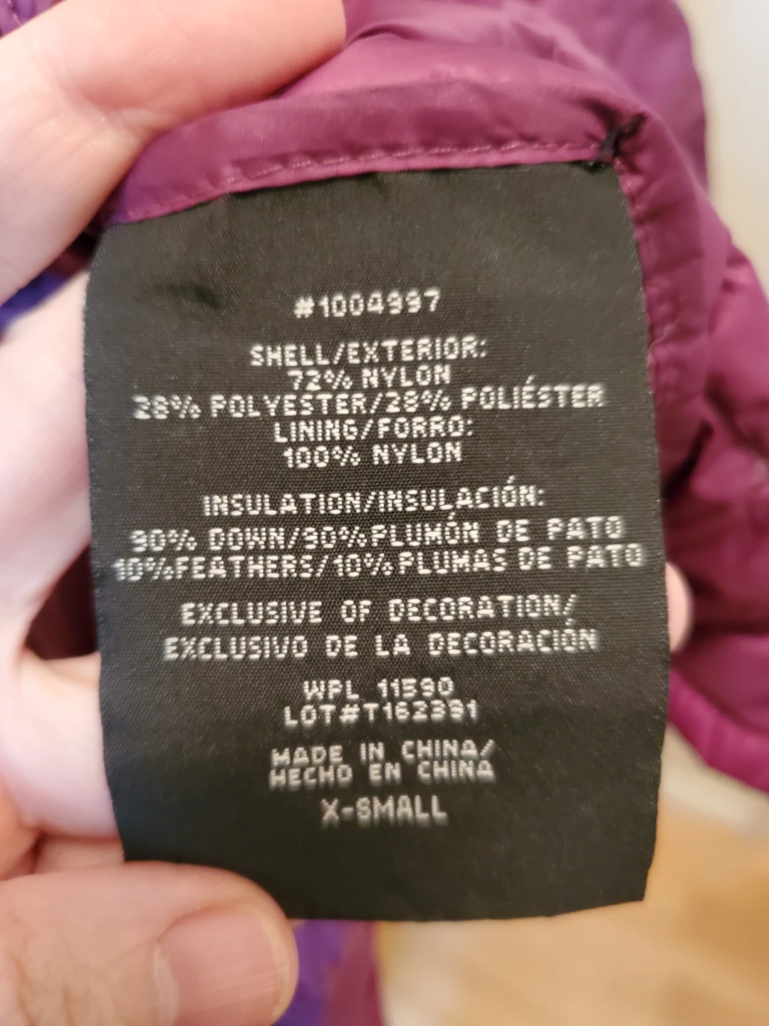 Selling a cute purple down puffer jacket! It's an X-Small size and made with 72% nylon and 28% polyester for the shell, and 100% nylon for the lining. The insulation is 90% down and 10% feathers. Perfect for staying warm and stylish! Cedar pick up.