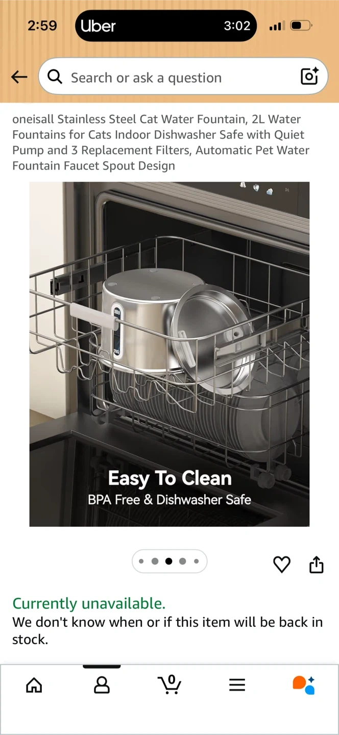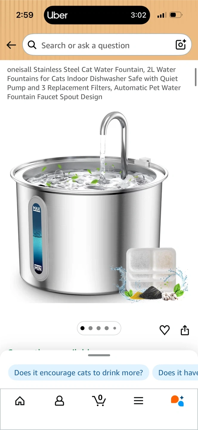 This is a 2L stainless steel cat water fountain. It's dishwasher safe and has a quiet pump. Includes 3 replacement filters and automatic pet water fountain faucet spout design. Keeps water circulating and purifying all day!