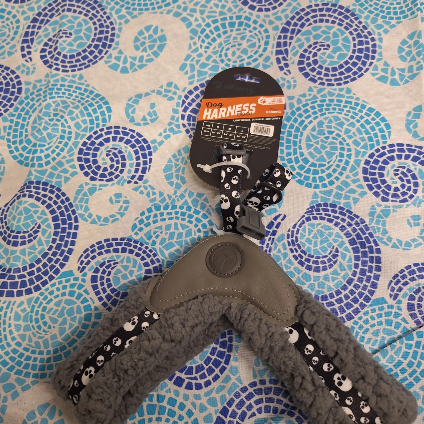 This is a small-sized Ruffwear dog harness in grey with a skull pattern. It's lightweight, durable, and has adjustable straps. Great for walks and hikes with your dog!