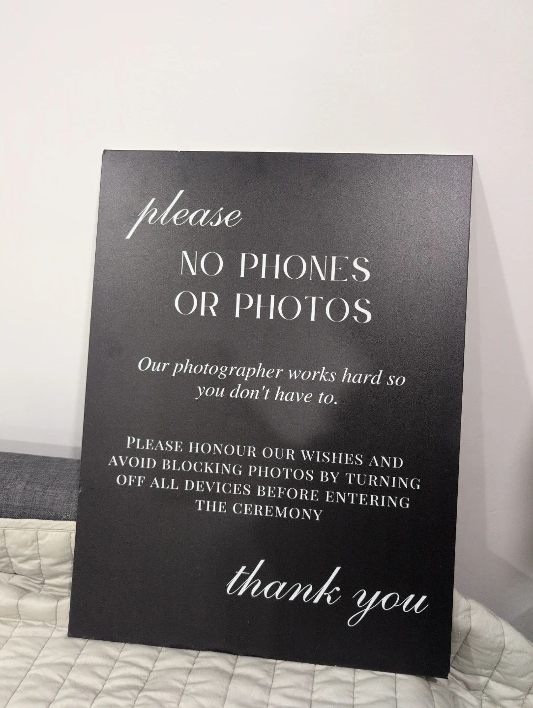 Buy & SellWedding sign - No photos pleaseWedding sign - No photos pleaseFreeBlack sign to request guests not take photos during the ceremony. ConditionNewWHERE TO MEETPickering GO StationView MapSELLERAmandaBay Ridges694 reviews0 chats·1 favorites·19 viewsSEND CHAT TO SELLERHi Amanda! I’m interested in your listing.Hi Amanda! I’m interested in your listing.Get the Karrot app to chatSign In to chat