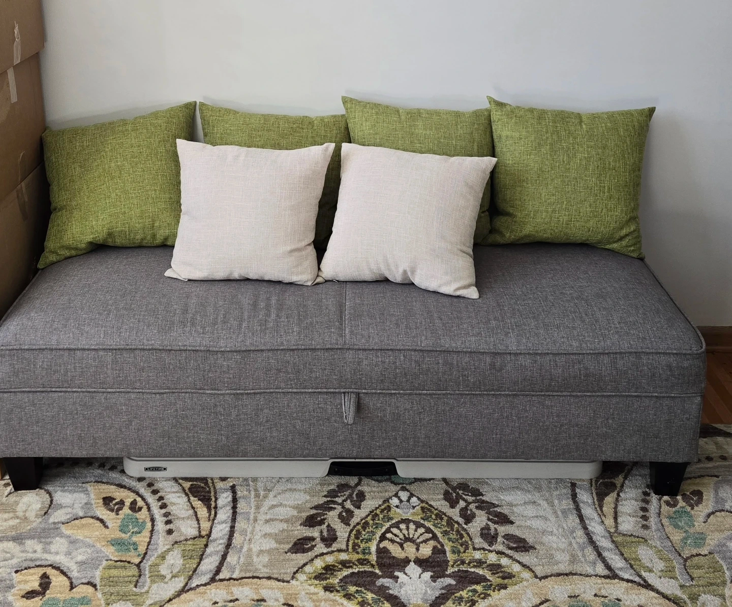 Comfortable grey fabric sectional sofa with a chaise lounge. Includes four green accent pillows and two cream accent pillows. This sofa offers ample seating space for your living room and has great storage in the lg. Ottoman
