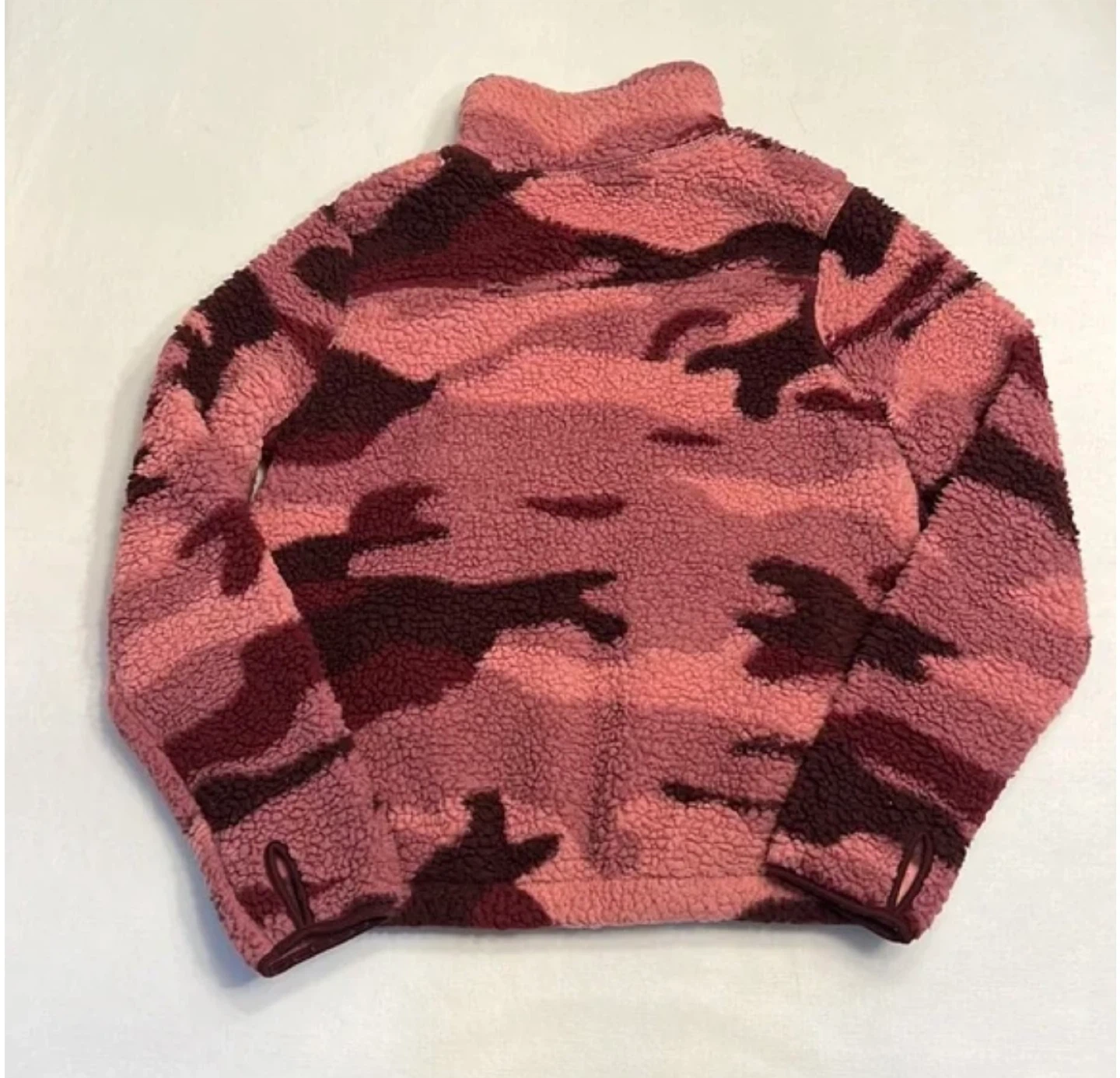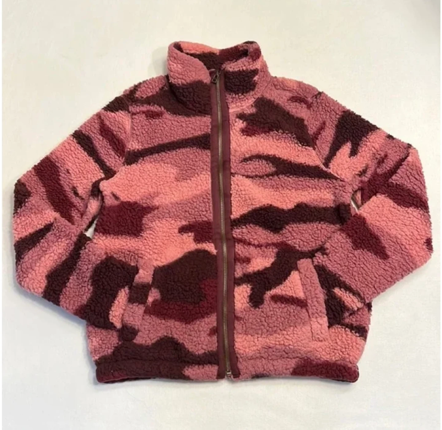 Cozy sherpa fleece jacket in a pink camouflage pattern. Features a full zip front and stand-up collar. Made with soft, warm material for comfort. Perfect for layering on cooler days!