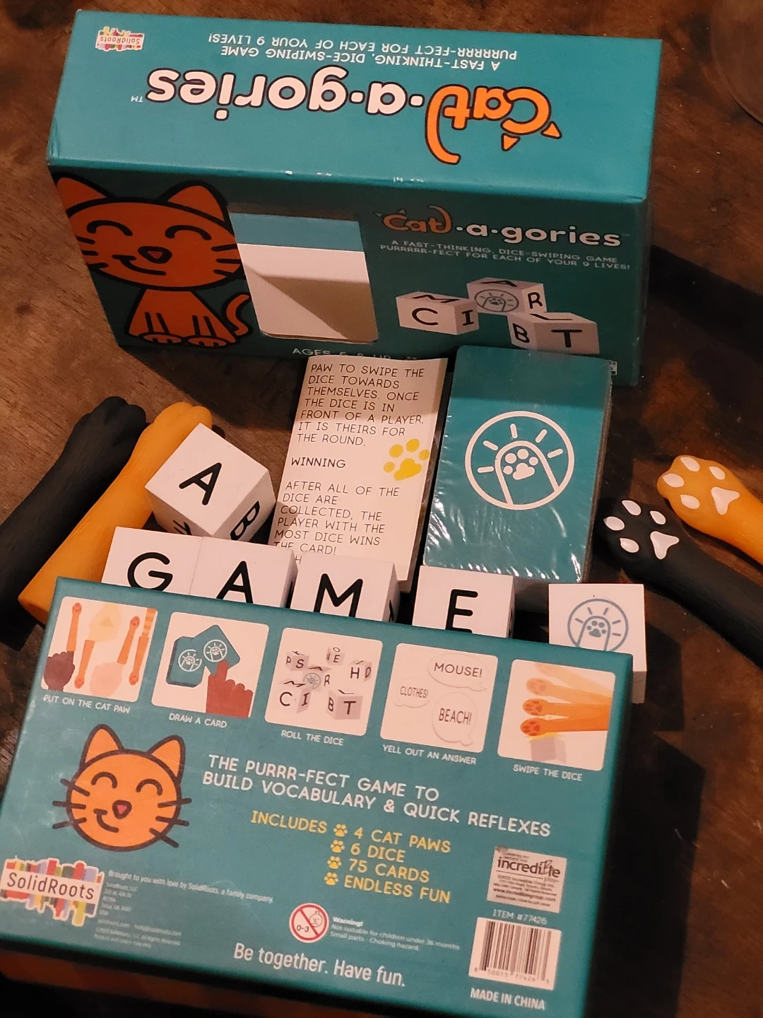 This is the Cat-a-gories game by Solid Roots. It's a fast-thinking, dice-swiping game designed to build vocabulary and quick reflexes. Includes 4 cat paws, 4 dice, and 75 cards for endless fun!