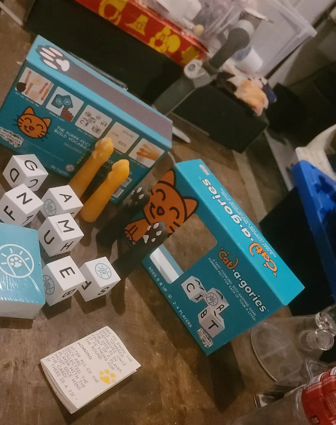 This is the Cat-a-gories game by Solid Roots. It's a fast-thinking, dice-swiping game designed to build vocabulary and quick reflexes. Includes 4 cat paws, 4 dice, and 75 cards for endless fun!