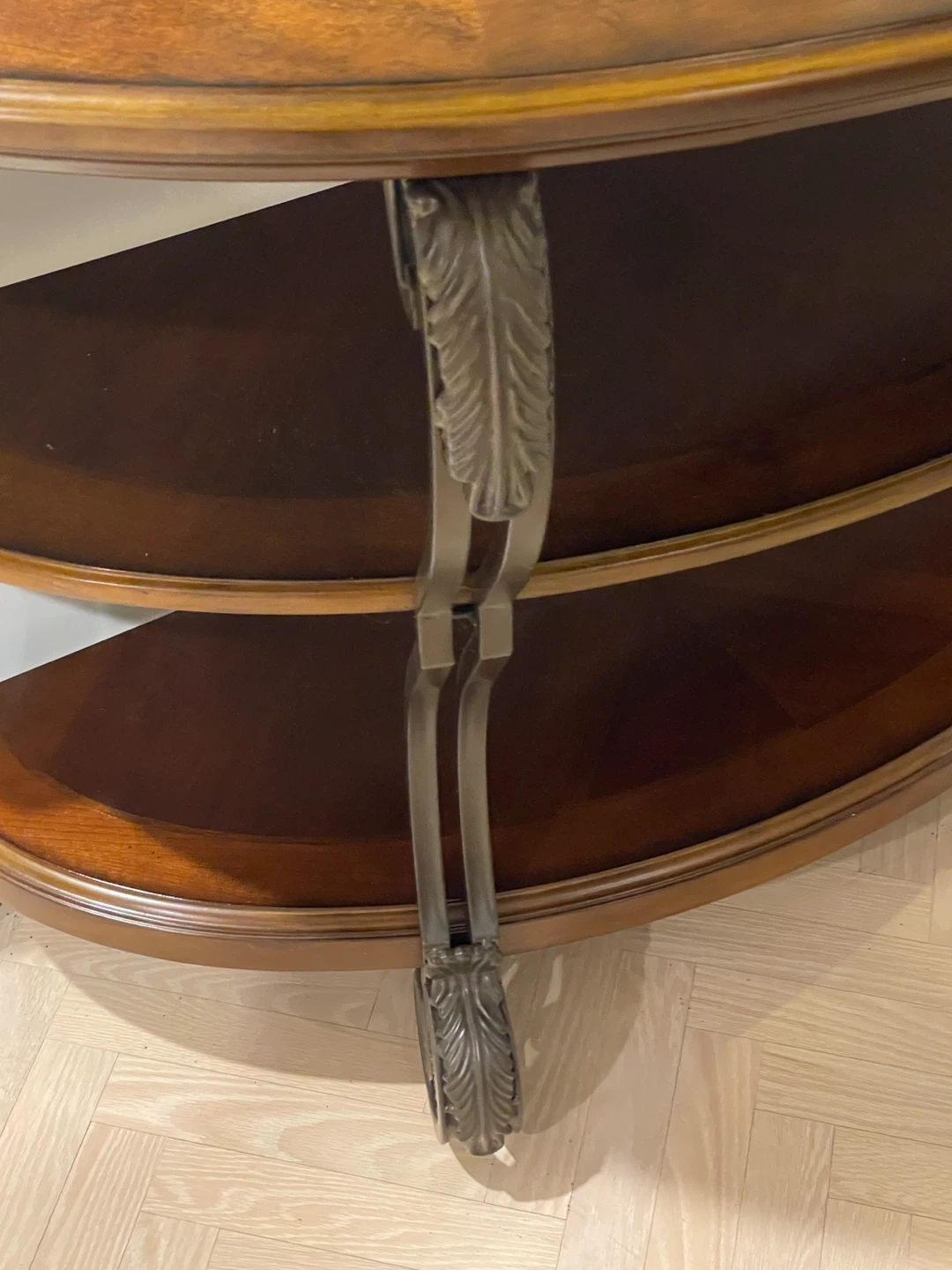 This decorative console table features a rich wood finish and a metal frame with ornate detailing. It has two additional shelves for storage or display. Its half-moon shape makes it ideal for entryways or hallways. For pick up in King City.