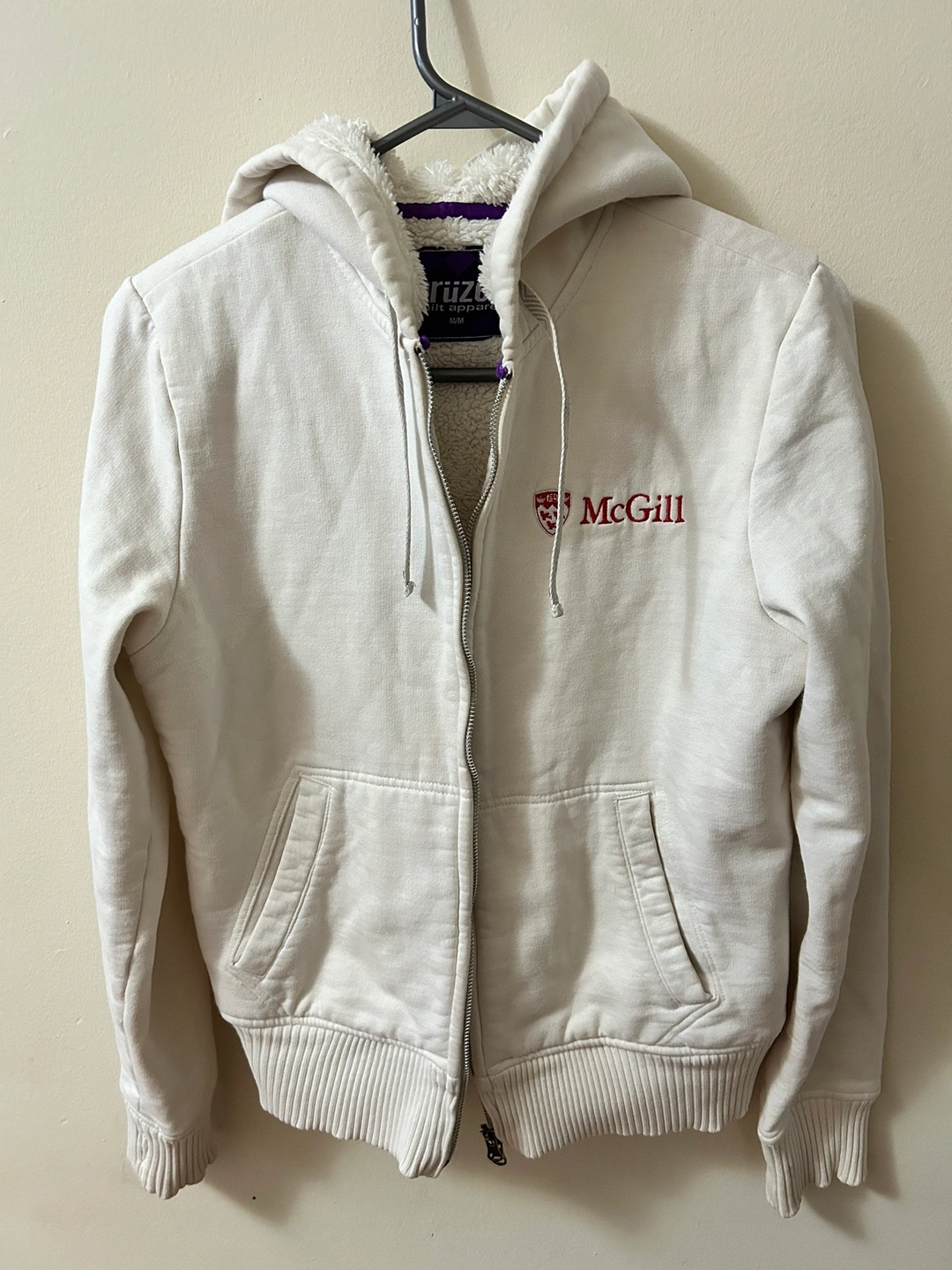 White hoodie with a purple zipper and a McGill University logo on the front. Lined with white fleece. Used a couple of times but still in good condition. Warm and soft. Can be unisex.